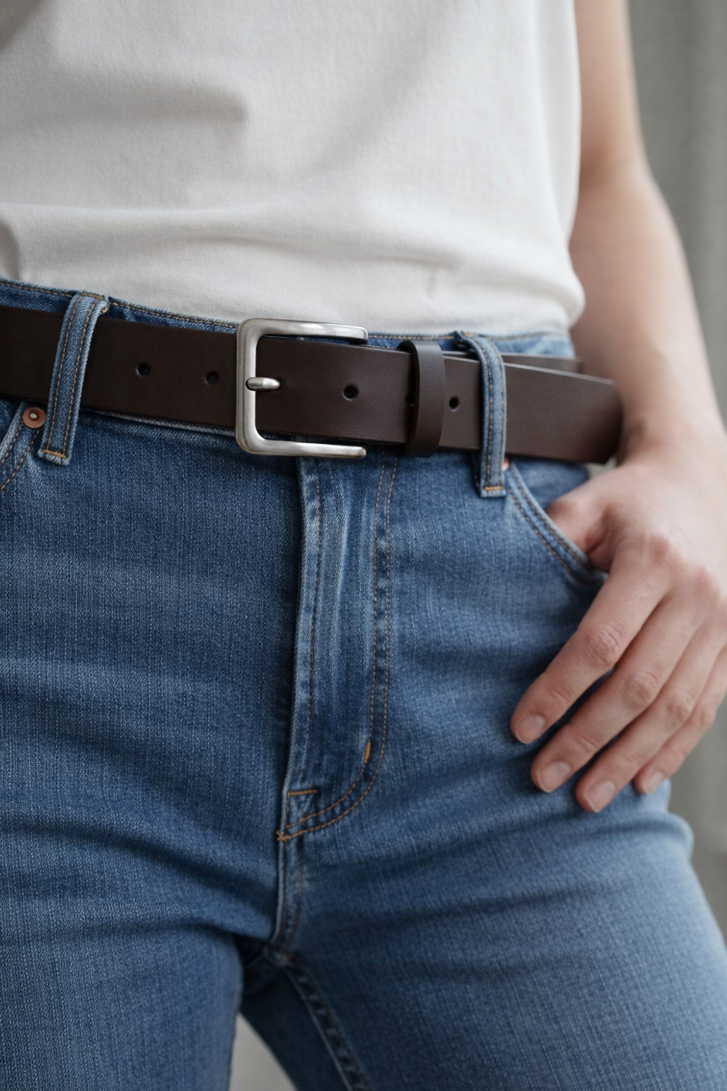 Hergestellt aus strapazierfähigem Rindsleder, das dem Gürtel eine exklusive Haptik und lange Haltbarkeit verleiht. Erhältlich in zwei klassischen Farben – Schwarz und Dunkelbraun – was es zu einem offensichtlichen Grundbestandteil der Garderobe macht.