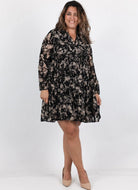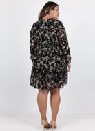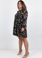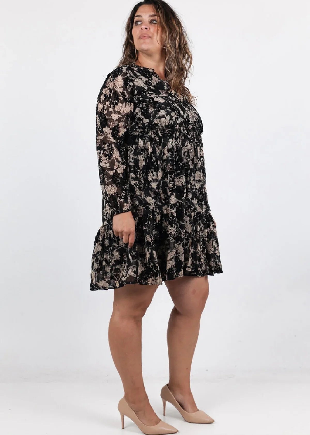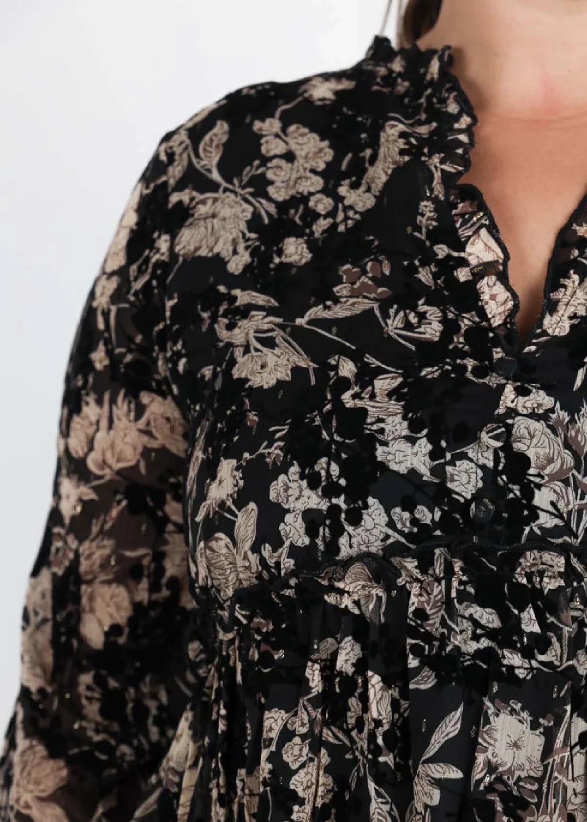 Ein romantisches und feminines Kleid mit wunderschönem Blumenmuster in Taupe am schwarzen Boden. V-Ausschnitt mit eleganter Rüschenkante und langen Ärmeln. Von der Büste nach unten ist das Kleid Knielänge und in Rüschen genäht, was ein weiches und verspieltes Gehäuse verleiht. Perfekt für den Alltag und die Party - das ganze Jahr über. Hergestellt aus 100% Polyester für einen leichten und konformen Stoff.