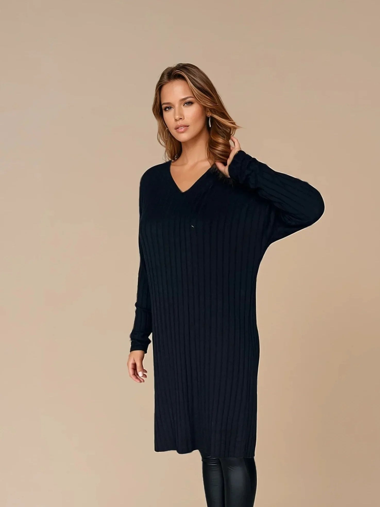 Das Kleid ist mit langen Ärmeln und V-Ring-Hals ausgestattet, was ein elegantes und zeitloses Gefühl verleiht.