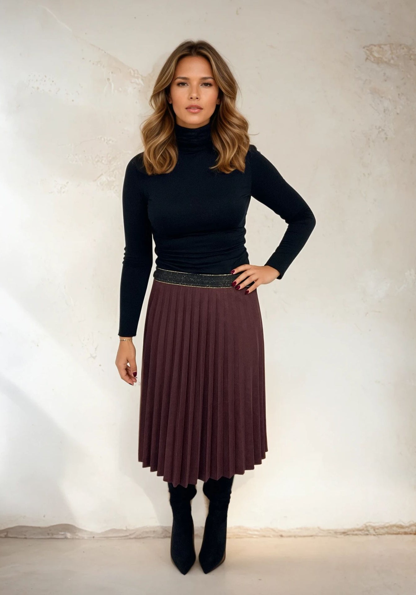 Eleganter und zeitloser Faltenrock in einem weichen und konformen Stoff. Das klassische Design mit Pleisionen verleiht eine schöne Silhouette und macht den Rock leicht, sowohl täglich als auch auf kleidetere Anlässe zu stylen. Die Taille ist elastisch mit einem dekorativen Gummiband, das eine bequeme Passform und ein schönes Detail verleiht.