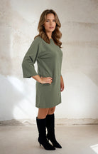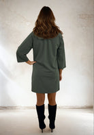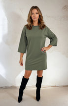 Ein stilvolles und komfortables Kleid in einem weichen und Stretch -Stoff, das sowohl Komfort als auch Bewegungsfreiheit bietet. Mit seiner geraden Passform und seiner drei Viertelhülle wird es zu einem vielseitigen Kleidungsstück, das genauso gut für den Alltag funktioniert wie bei kleideten Anlässen. Das Kleid kann je nach Look leicht mit Stiefeln oder Turnschuhen gestaltet werden.