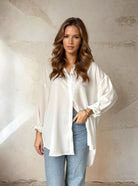 Elegant und zeitlos übergroßes Hemd in einem weichen und konformen Stoff. Mit seiner entspannten Passform und einer zusätzlichen Länge von 80 cm wird es zu einem vielseitigen Kleidungsstück, das genauso gut für den Alltag funktioniert wie für einen gekleideten Look. Perfekt, um sowohl in Jeans gefüllt als auch lose über Hosen für eine moderne und schicke Silhouette zu tragen.