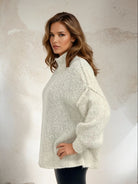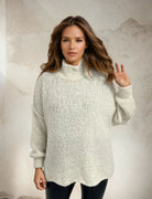 Es hat einen Breites Rippenstrick halb Polo, heruntergekommene Schultern und lange Ärmel mit gerippten Manschetten, die eine kostenlose, aber stilvolle Silhouette erzeugen. Perfekt, um mit Lederhosen, Jeans oder Rock für einen trendigen Herbst- und Winterlook zu stylen.