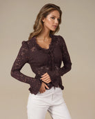 Feminin und raffiniert-diese Spitze mit seinem V-Ring mit Rüschen, die ein leichtes und elegantes Gefühl verleihen. Der integrierte Bonneufodire bietet Komfort und Diskretion und unterstreicht gleichzeitig die subtile Transparenz der Spitze. Ein schickes und trendiges Top, perfekt, um den Alltag und den Abend zu heben.