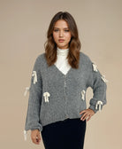 Das Modell hat eins Entspannte Passform mit Tiefes V-Ring, Knöpfe vorne Und gerippte Manschetten, die das Design rahmen. Die dekorativen Rosetten bilden einen süßen Kontrast zur Grundfarbe und machen die Strickjacke zu einem echten Statement -Kleidungsstück, das jedes Outfit anhebt.