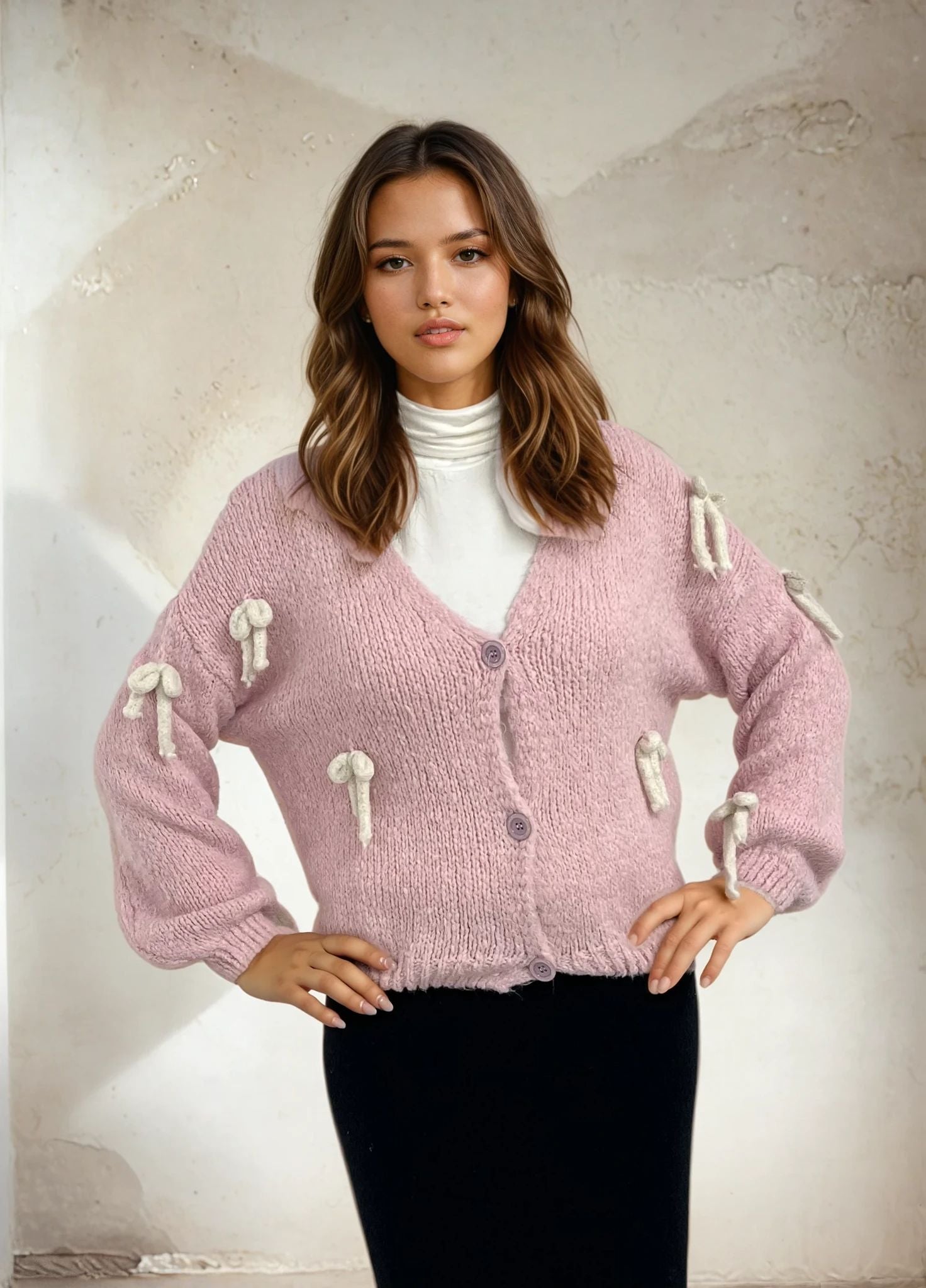 Das Modell hat eins Entspannte Passform mit Tiefes V-Ring, Knöpfe vorne Und gerippte Manschetten, die das Design rahmen. Die dekorativen Rosetten bilden einen süßen Kontrast zur Grundfarbe und machen die Strickjacke zu einem echten Statement -Kleidungsstück, das jedes Outfit anhebt.