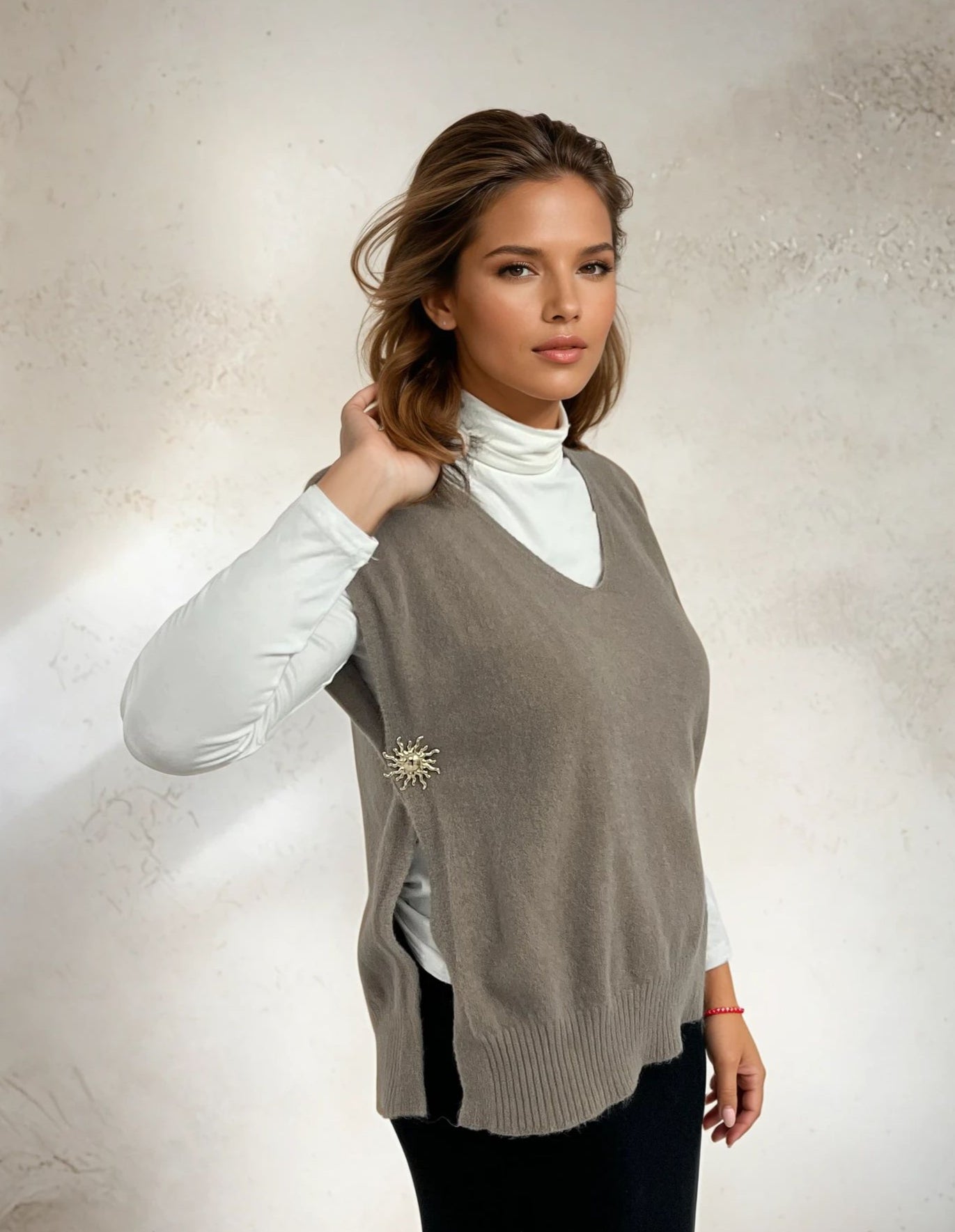 Das Modell hat Tiefes V-Ring, Seiten offen Unter dem Sonnenknopf und den Seitenschlitzen und einer luftigen und modernen Silhouette. Perfekt, um ein Hemd, ein Poloshirt oder eine Bluse für einen schönen Look auf dem Schicht zu übertragen. Der dekorative Sonnenknopf auf der Seite wird zu einem anspruchsvollen Detail, das die Weste jeden Tag so schön macht wie für festliche Anlässe.