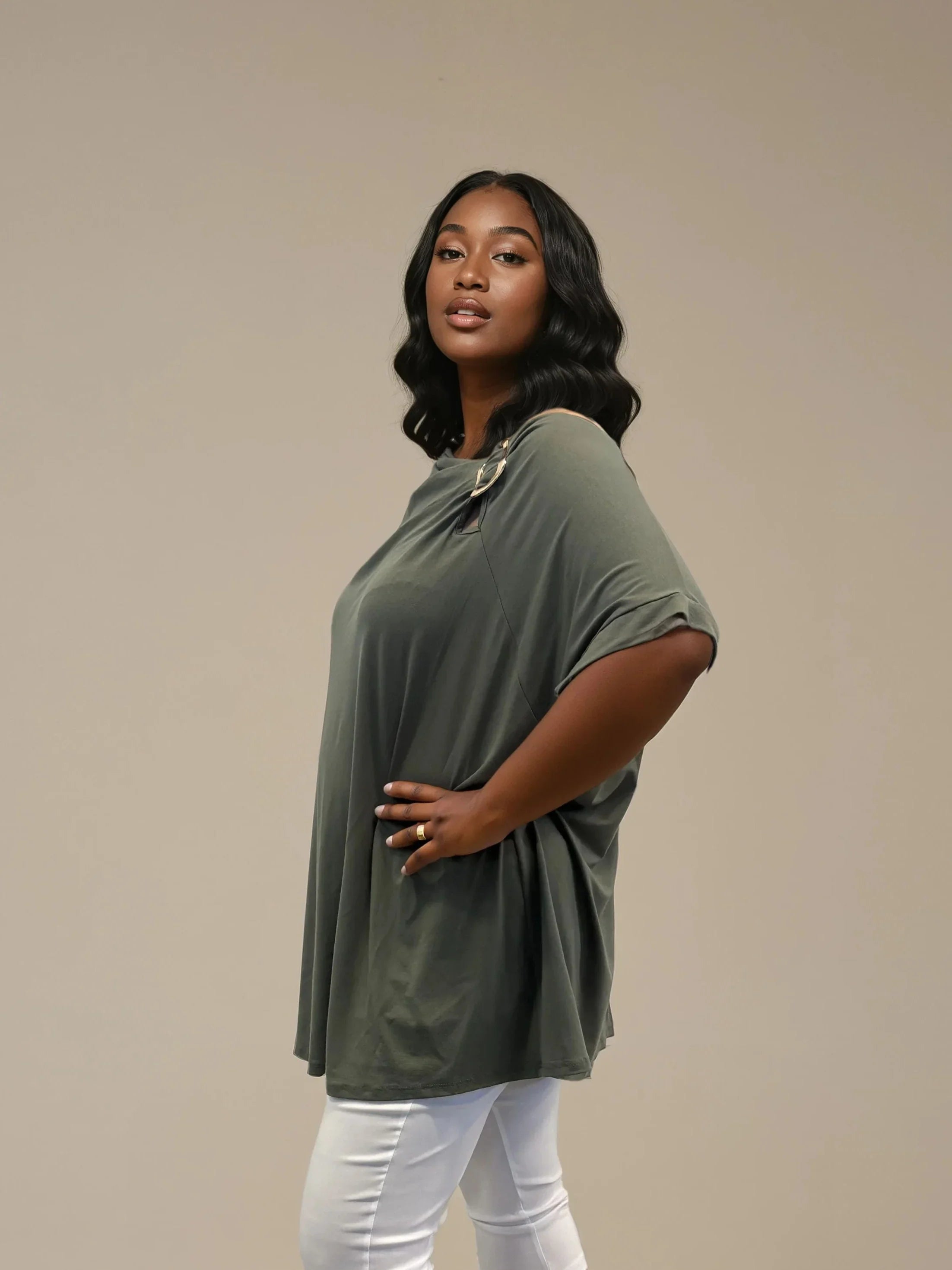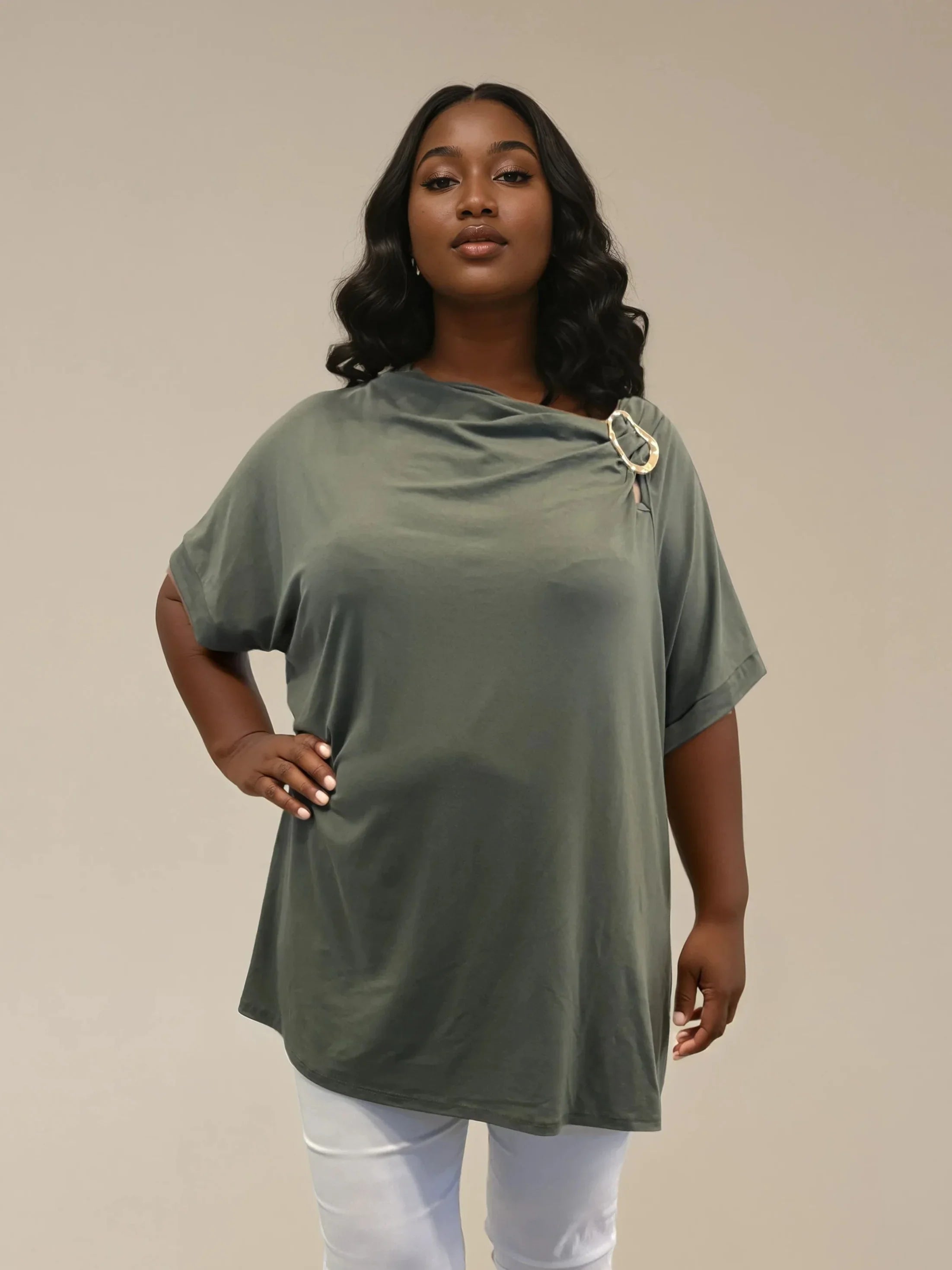 Eine elegante und feminine Oberseite mit wunderschönen drapierenden und stilvollen goldenen Schnalle an der linken Schulter ✨. Dieses breite Modell hat eine kurze Ärmel und ein feines Gehäuse, das eine schmeichelhafte Silhouette ergibt. Runder Ausschnitt und gerade Boden machen es leicht zu stylen - perfekt für den Alltag und die Party! 💃