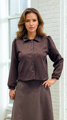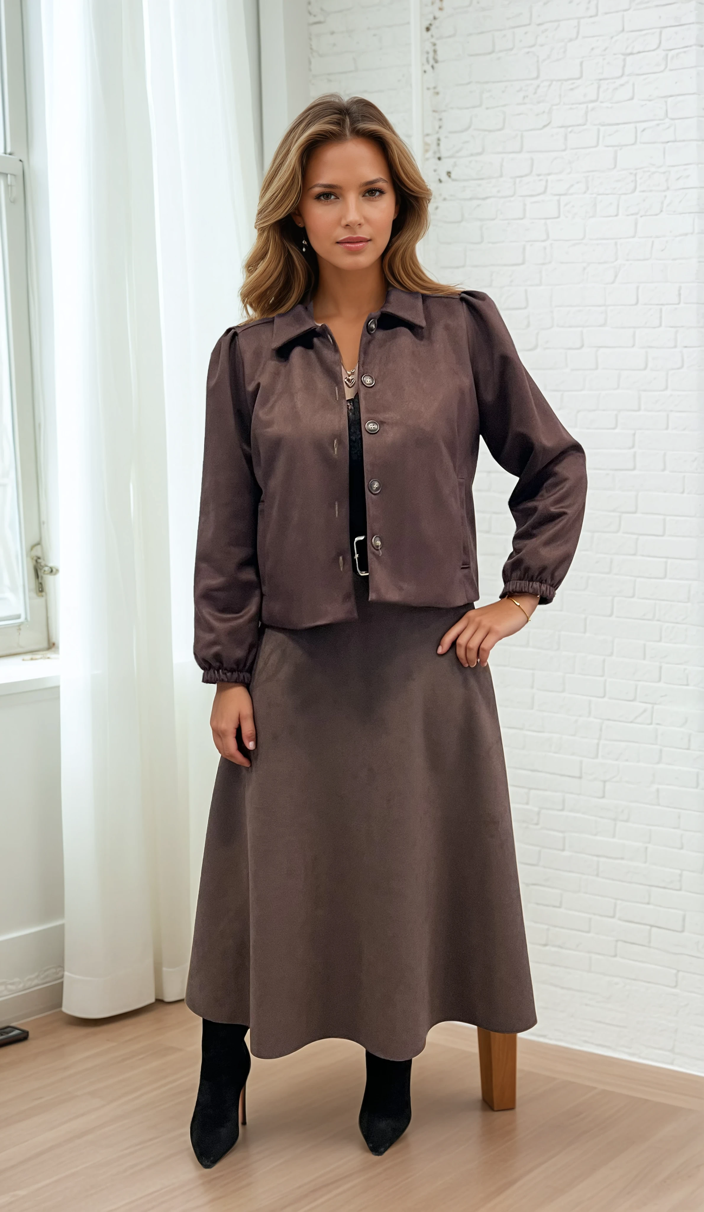 Die Jacke vereint eine zeitlose Silhouette mit moderner Wildlederoptik und bequemer Passform. Es ist einfach zu stylen, wirkt elegant und sieht zusammen mit dem passenden Rock besonders stilvoll aus – ein perfektes Set für eine durchdachte Garderobe.