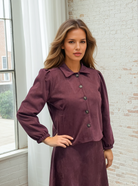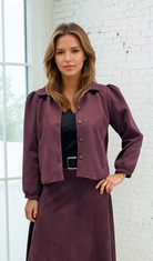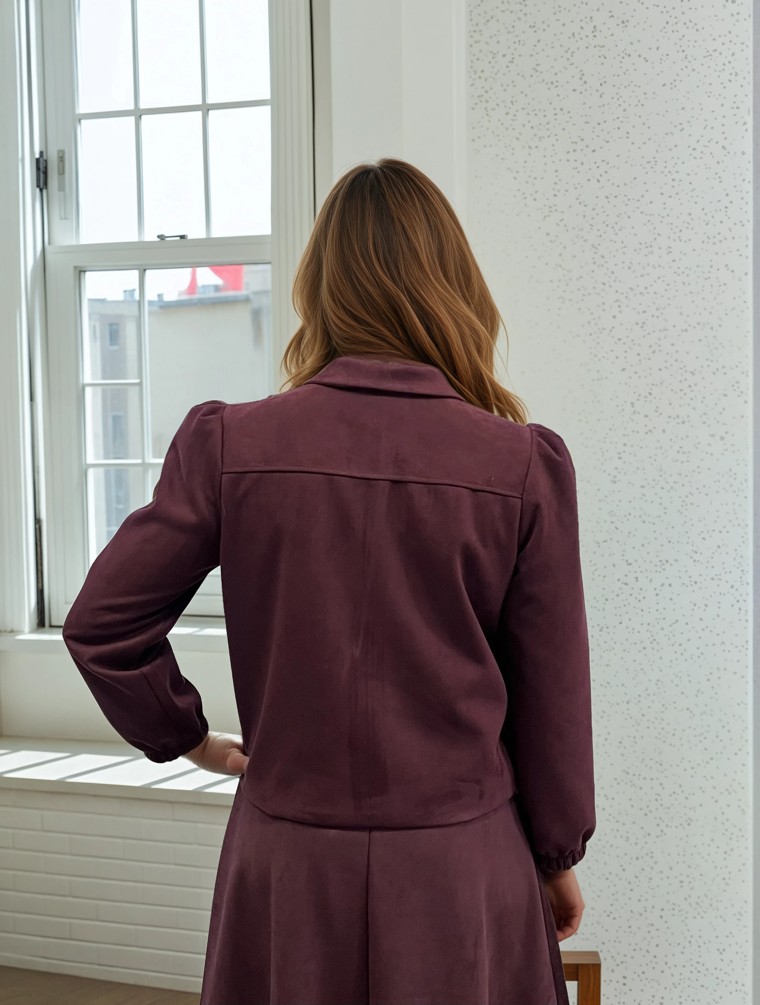 Die Jacke vereint eine zeitlose Silhouette mit moderner Wildlederoptik und bequemer Passform. Es ist einfach zu stylen, wirkt elegant und sieht zusammen mit dem passenden Rock besonders stilvoll aus – ein perfektes Set für eine durchdachte Garderobe.