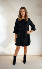 Funkelnder Glamour mit femininer Note ✨ Paillettenkleid Alicia von Mirelle Design ist ein festliches Kleid mit schimmernden Pailletten und einem eleganten offenen Rücken, der mit einer schwarzen Schleife gebunden ist. Ein Kleid, das Stil, Komfort und Party-Feeling auf beste Weise vereint. Die Passform ist entspannt und bequem und eignet sich daher sowohl für Dinnerpartys als auch für Weihnachts- oder Neujahrsfeiern.