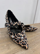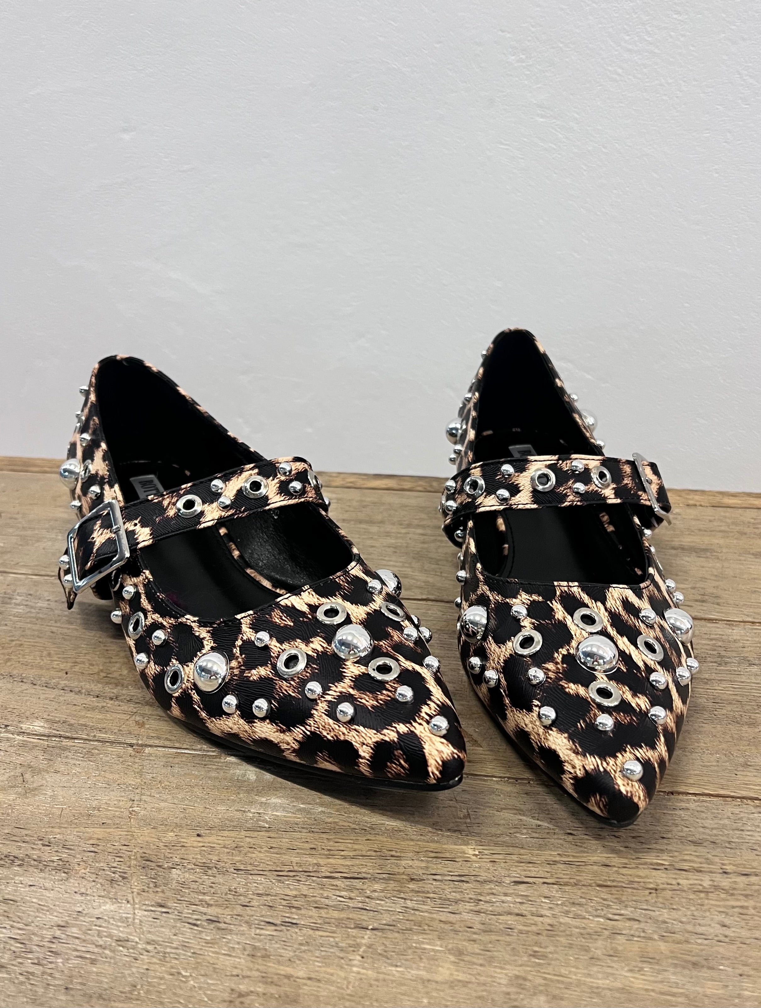 Verleihen Sie Ihrem Outfit mit diesen spitzen Ballerinas mit Leopardenmuster eine trendige und selbstbewusste Note. Das klassische Mary-Jane-Modell erhält durch dekorative silberne Nieten und Metallringe einen kantigen Touch, der für einen frechen, aber eleganten Look sorgt. Das Material mit Leopardenmuster verleiht dem Schuh ein modisches Flair, während die spitze Spitze zu einer femininen und stilvollen Silhouette beiträgt.