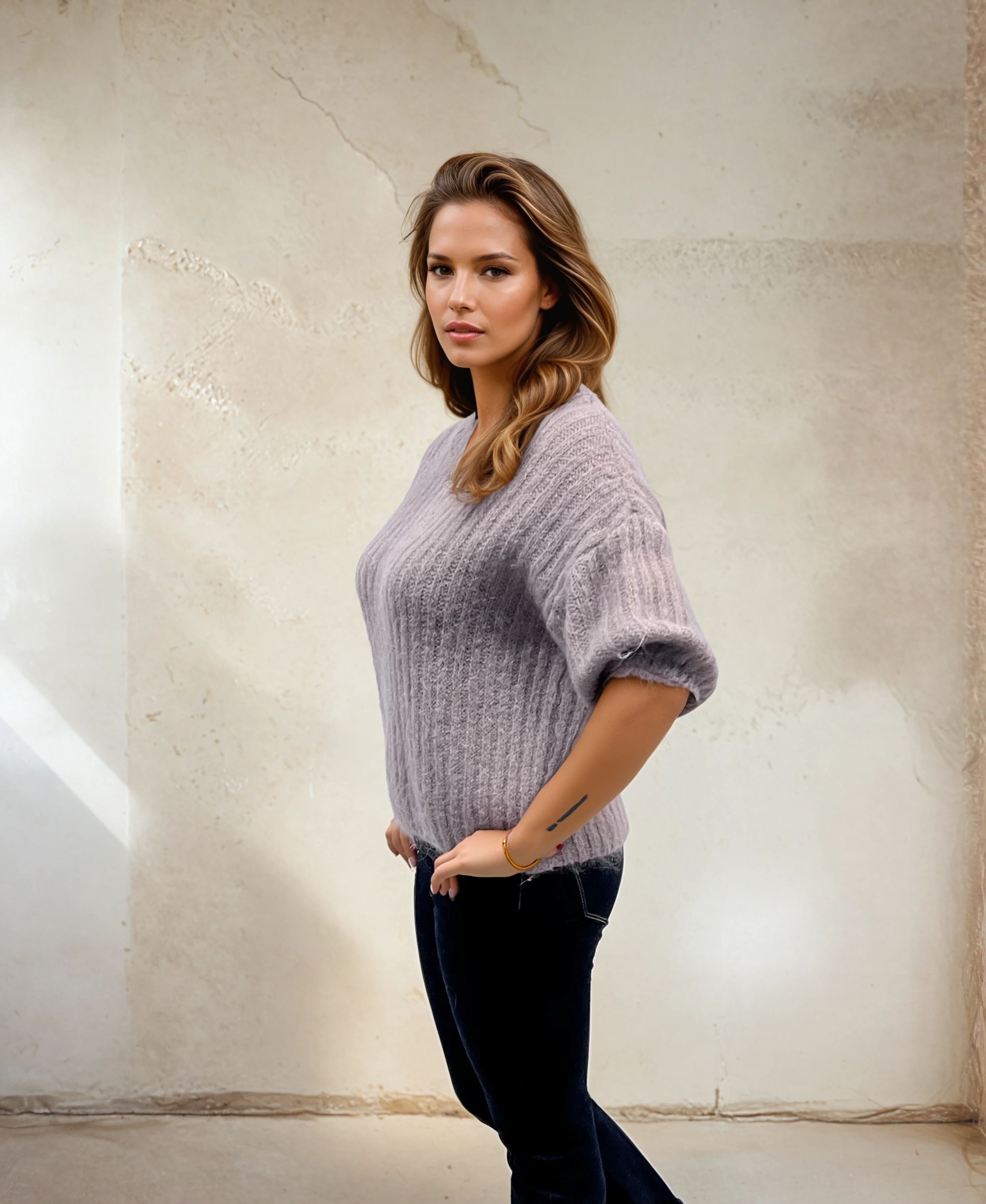 Kurzärmliger Mohairpullover ist ein leichter und luftiger Strickpullover mit weichem, exklusivem Ausdruck – perfekt für Frühling und Sommer 🌸 Der flauschige Mohair-Mix verleiht dem Kleidungsstück einen eleganten und femininen Touch, während die Rippstruktur für einen stilvollen und modernen Eindruck sorgt.