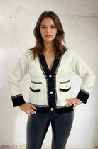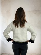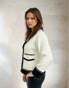 Die elegante weiße Basis wird durch hervorgehoben Schwarze Kontrastkanten mit Elementen von Diskrete Golddetails, sowie Dekorative Knöpfe Das verleiht einen raffinierten und exklusiven Look. Das Modell hat Lange Ärmel Und Details auswählen, was eine perfekte Balance zwischen Klassiker und Trend schafft.