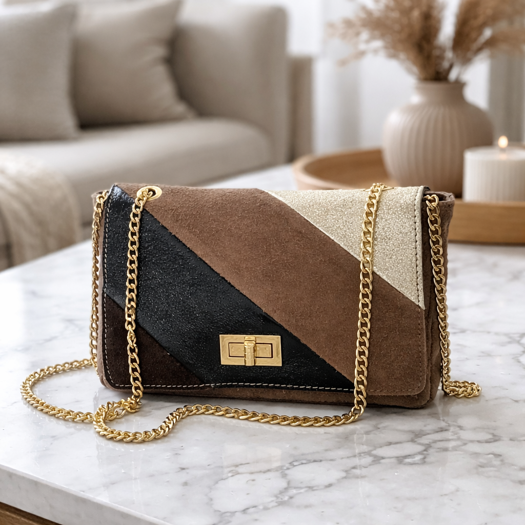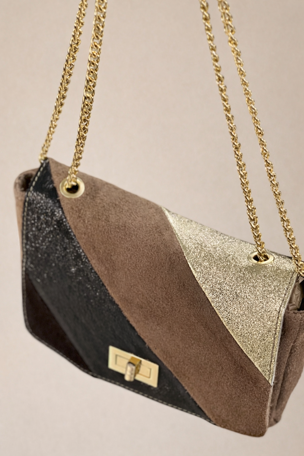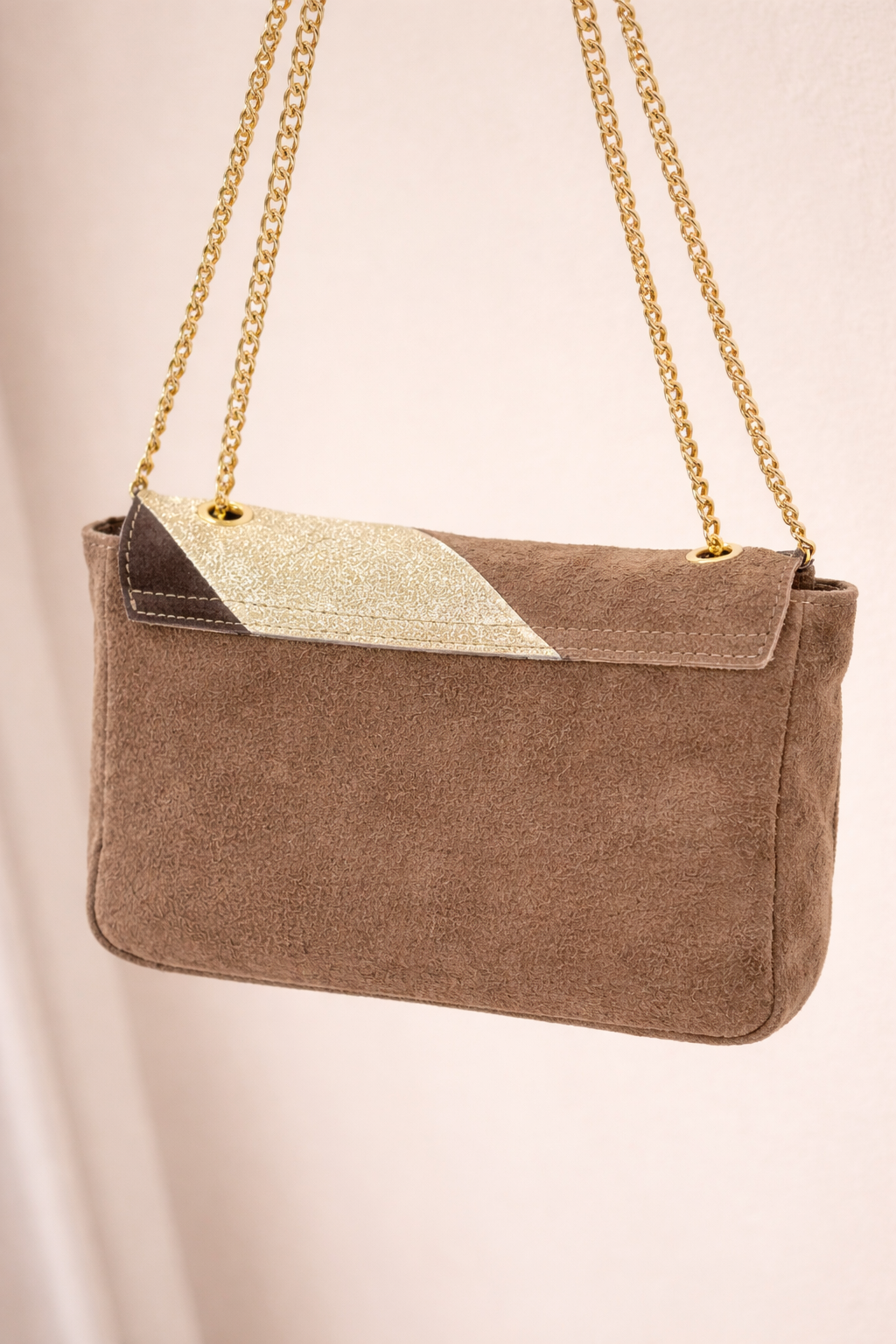 Alma is a stylish and modern bag in soft suede with elegant gold details. The small size makes it perfect for both everyday and parties, and the classic shape makes it suitable for all outfits. Available in two stylish colors: taupe and camel.