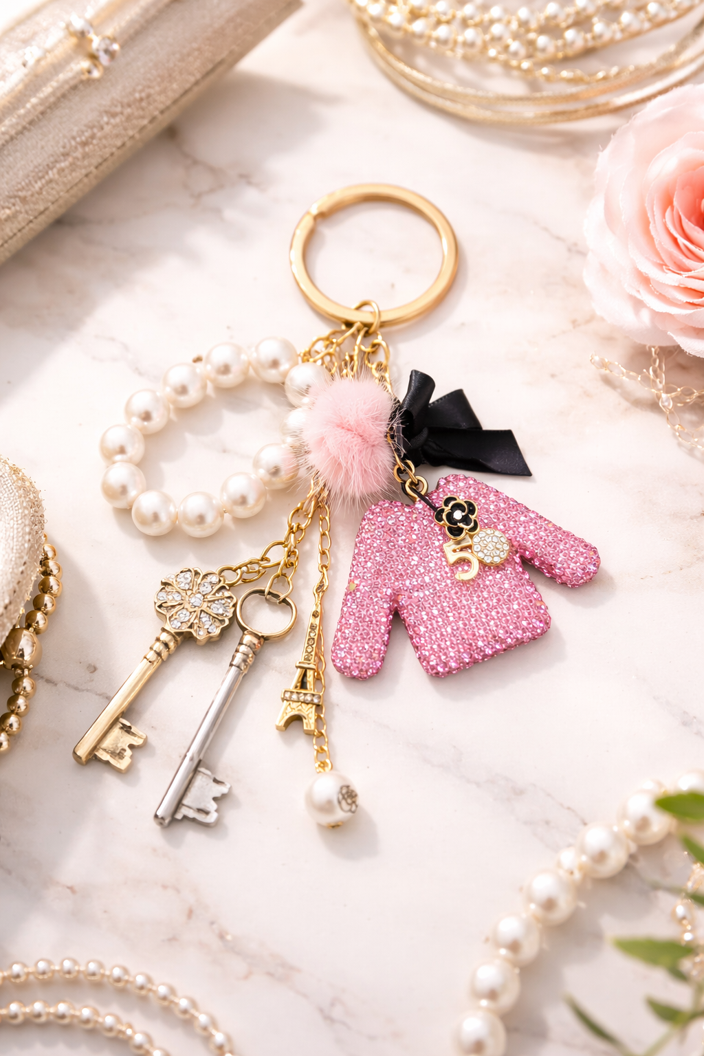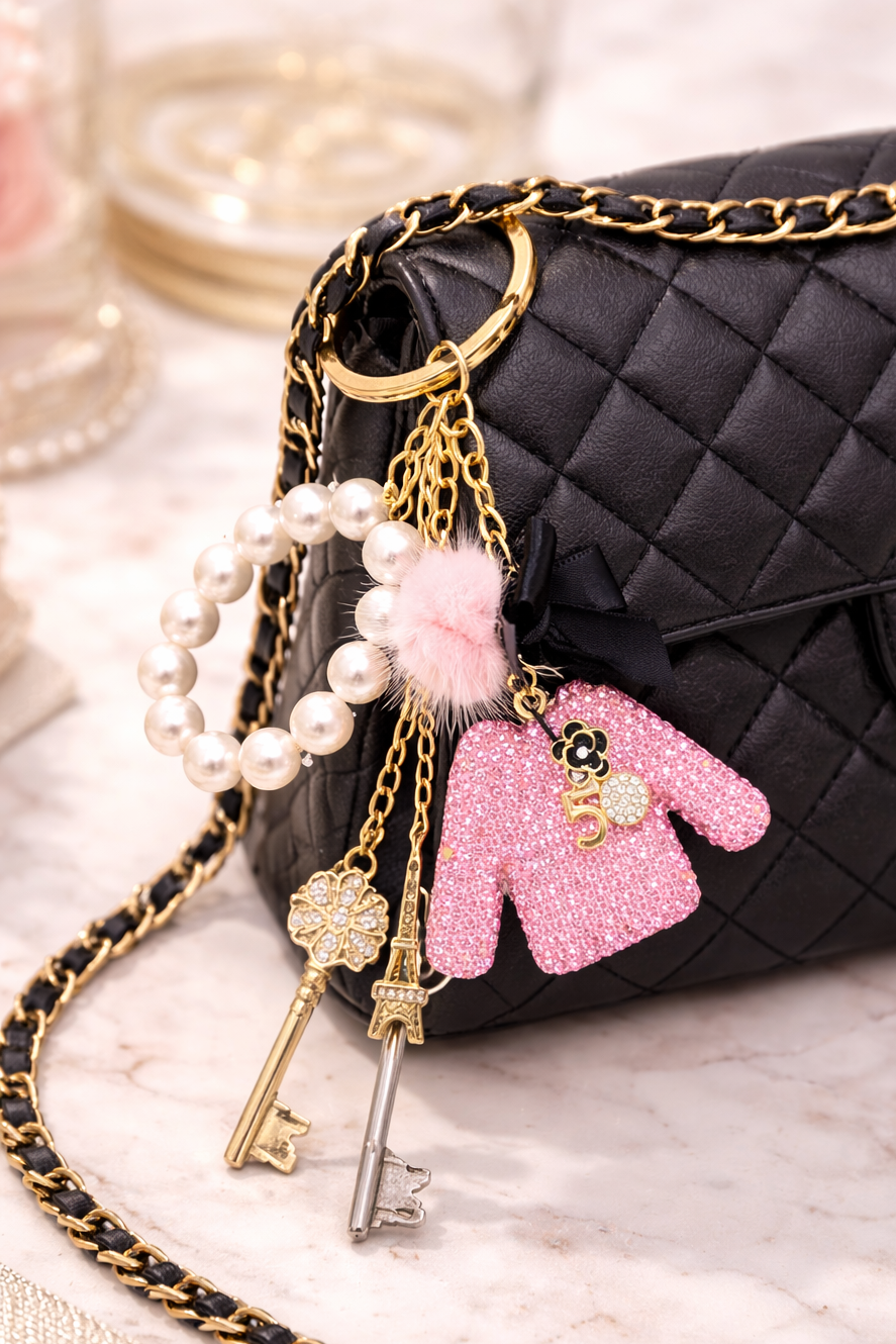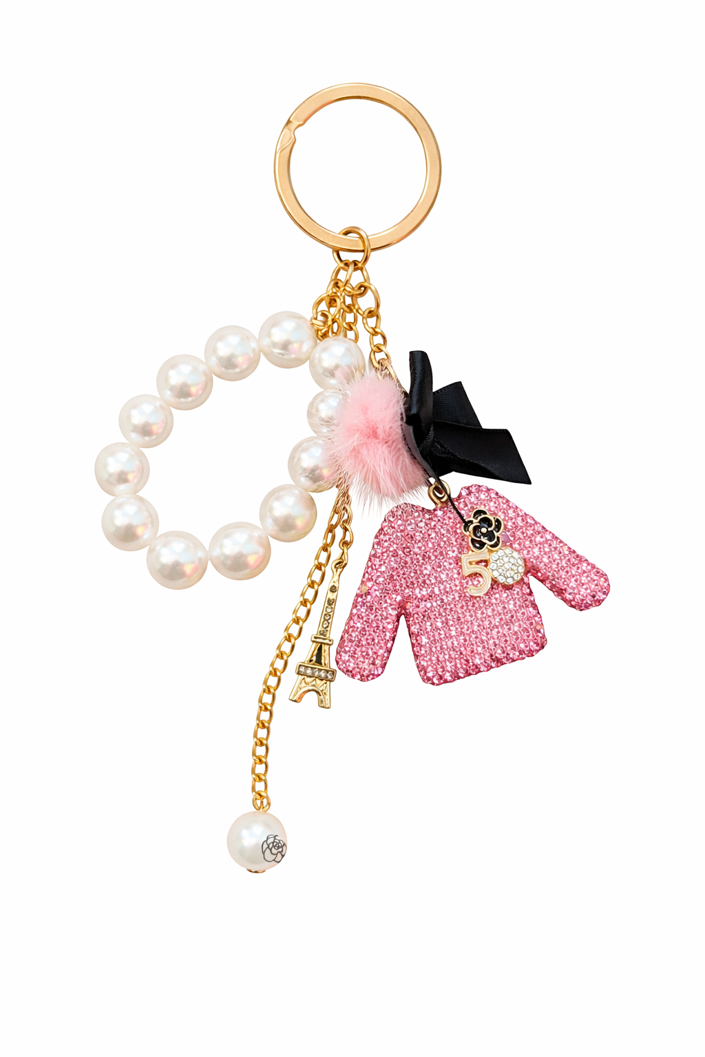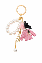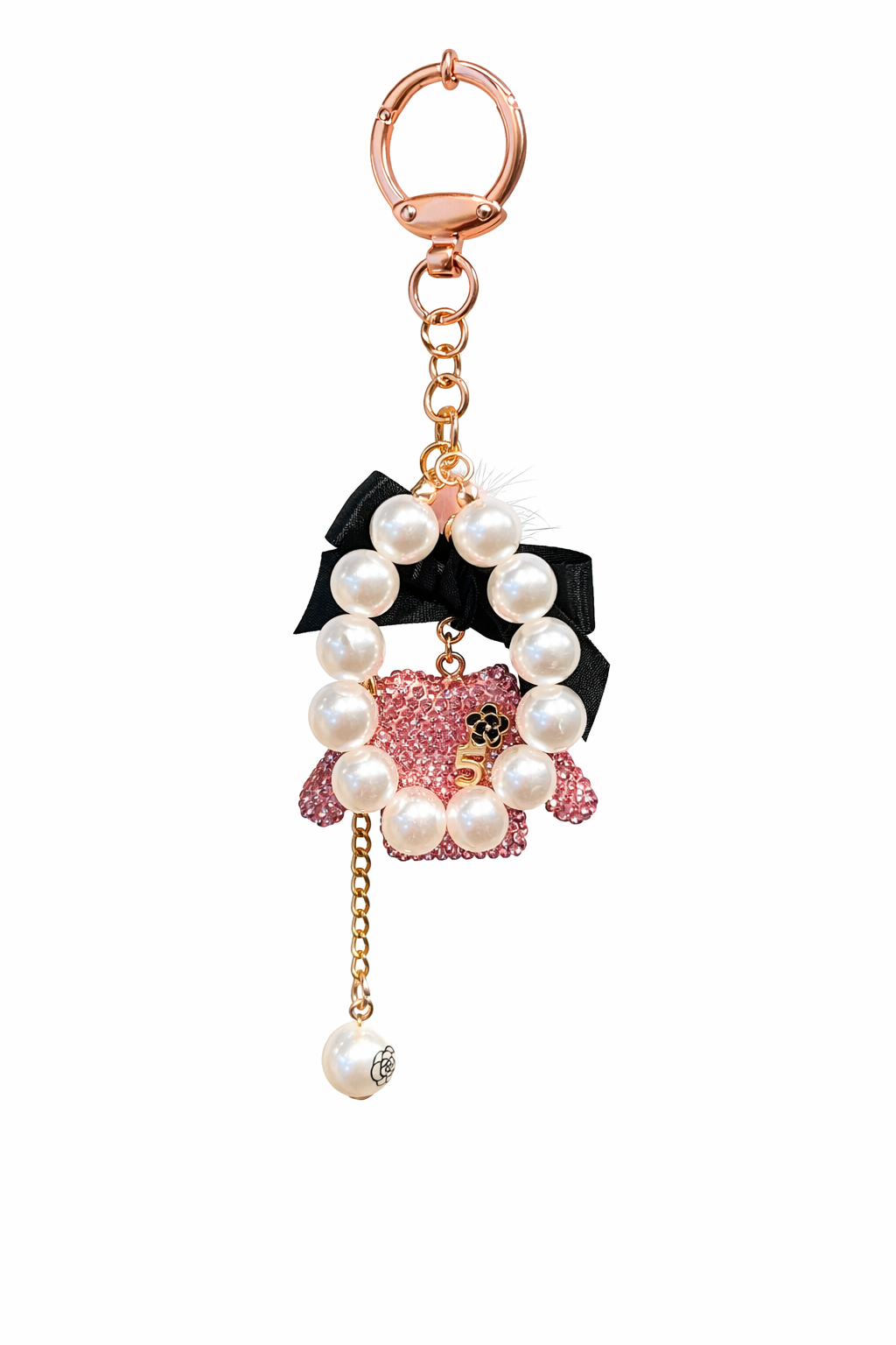 Give your keys - or your bag - an exclusive touch with this stylish key ring. The design combines classic pearls, gold details and a decorative black jacket with shimmering stones. The black bow and the soft faux fur detail create a feminine and luxurious feel.