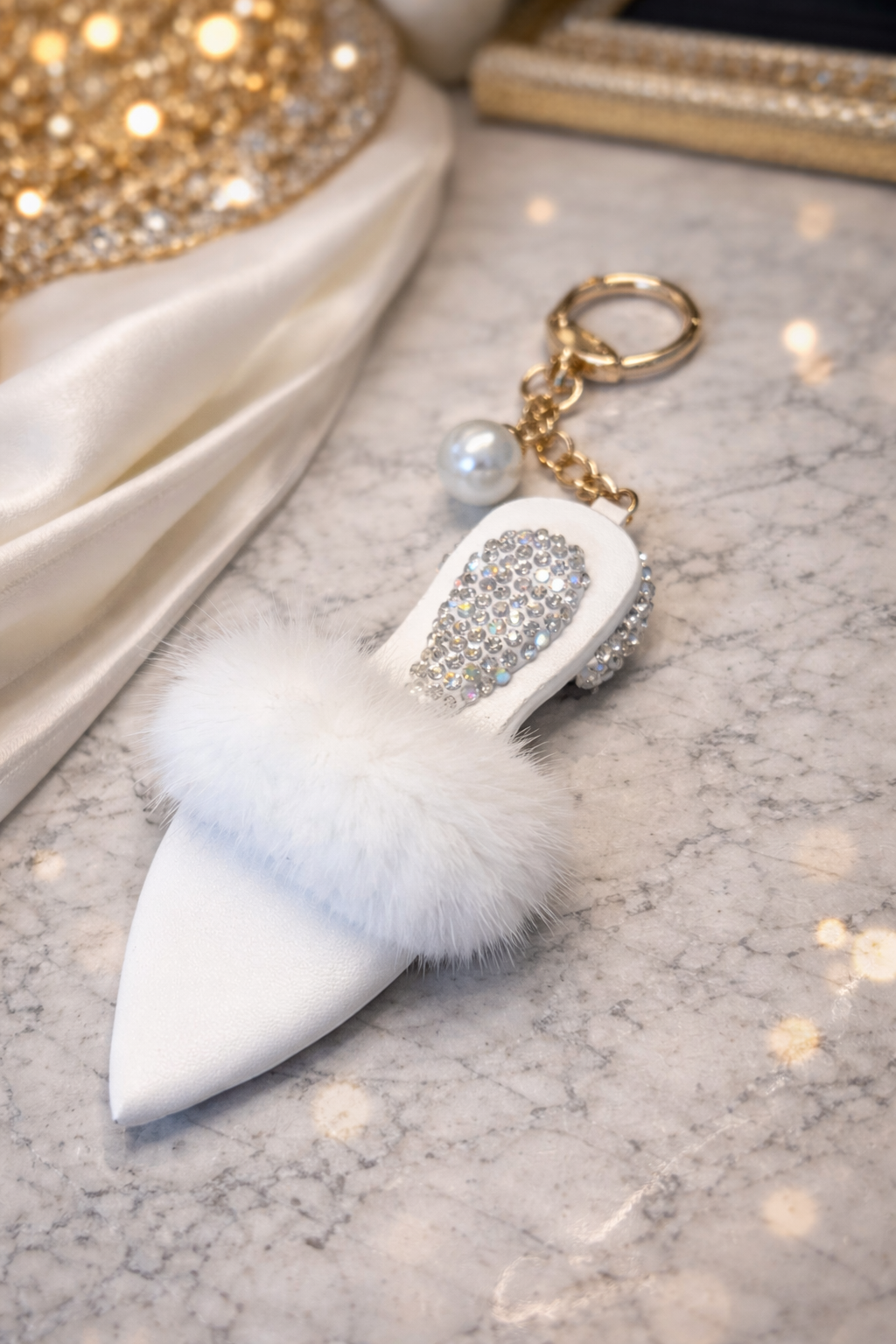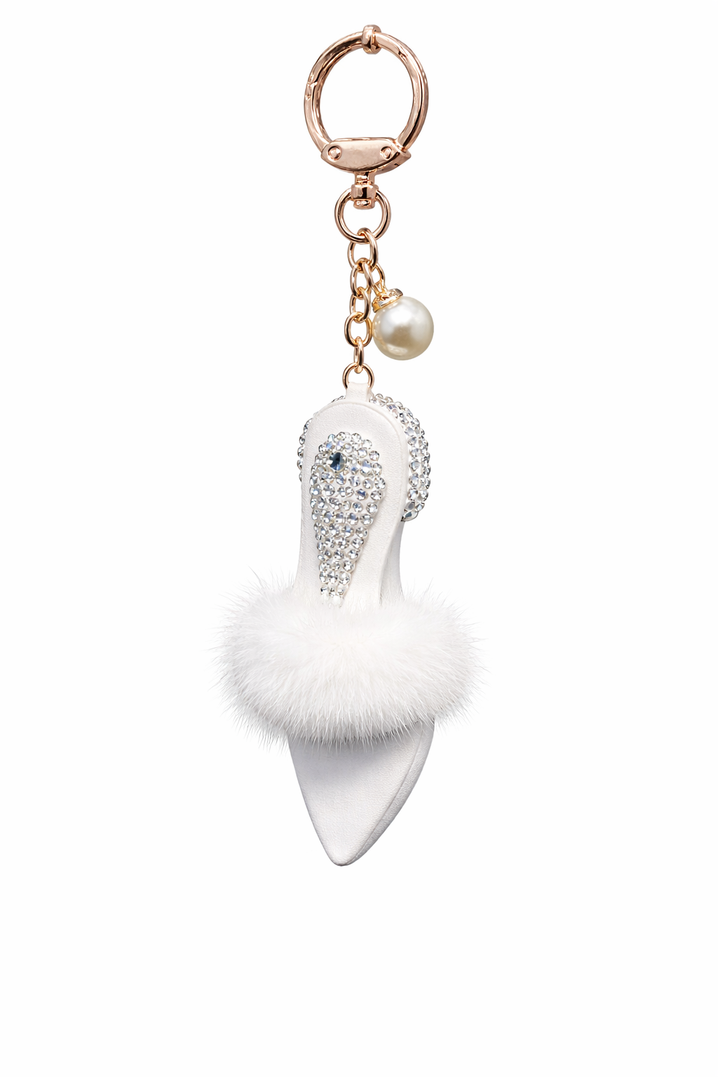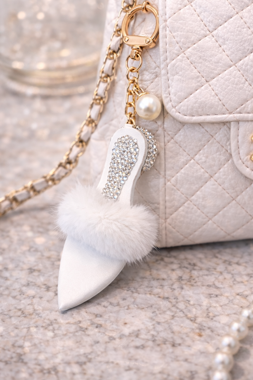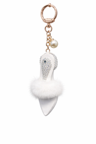 An exclusive and feminine key ring in the shape of an elegant high-heeled shoe, decorated with sparkling rhinestone details and soft faux fur. This stylish accessory is perfect as bag charm or key charm and gives a luxurious touch to both handbag and key chain.