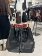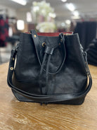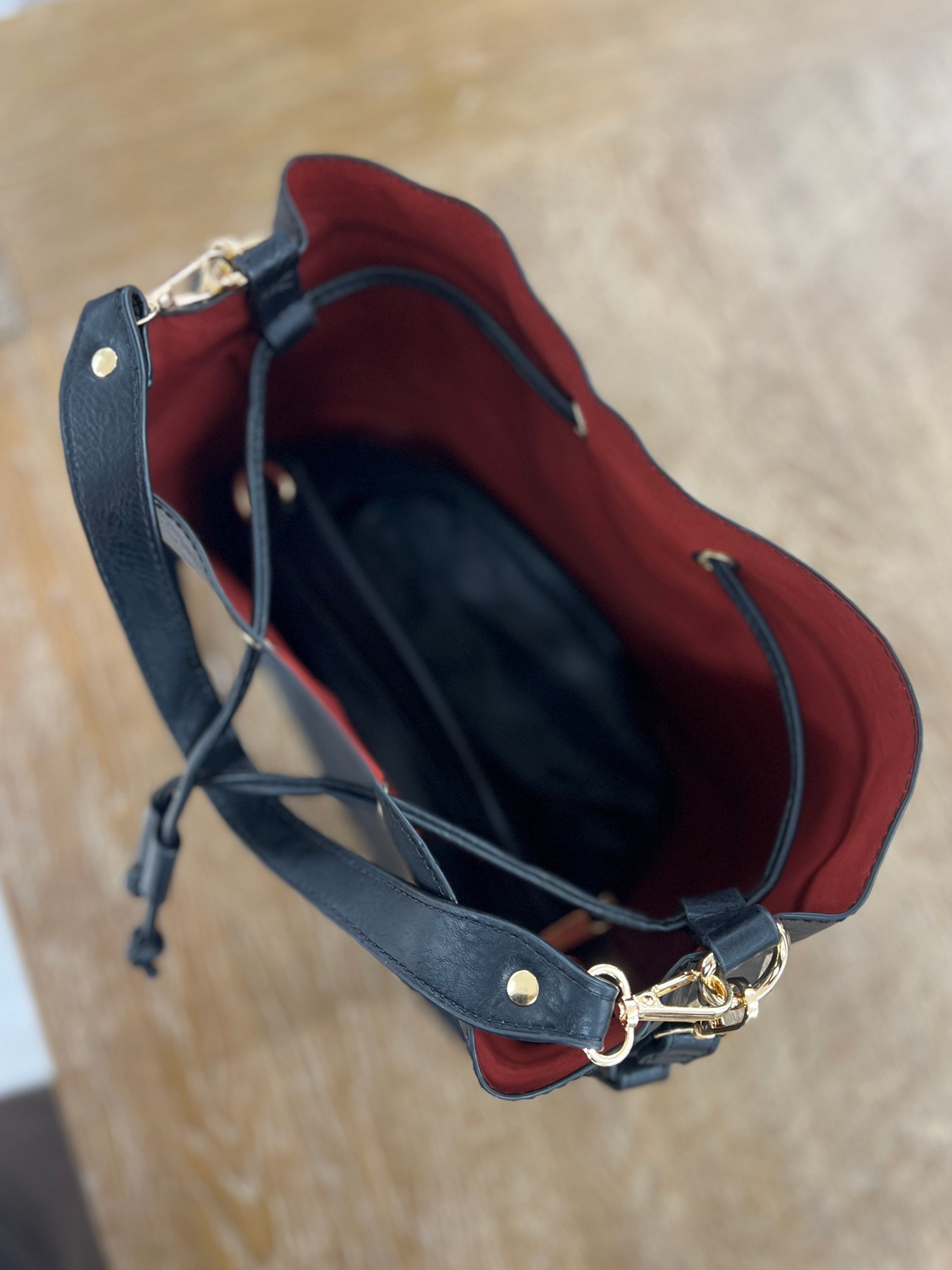 A stylish and spacious bucket bag in soft, textured material. The bag has a decorative and practical drawstring closure as well as gold-colored metal details that provide an elegant finish. The inside is dressed in a contrasting red color that gives an exclusive impression.
