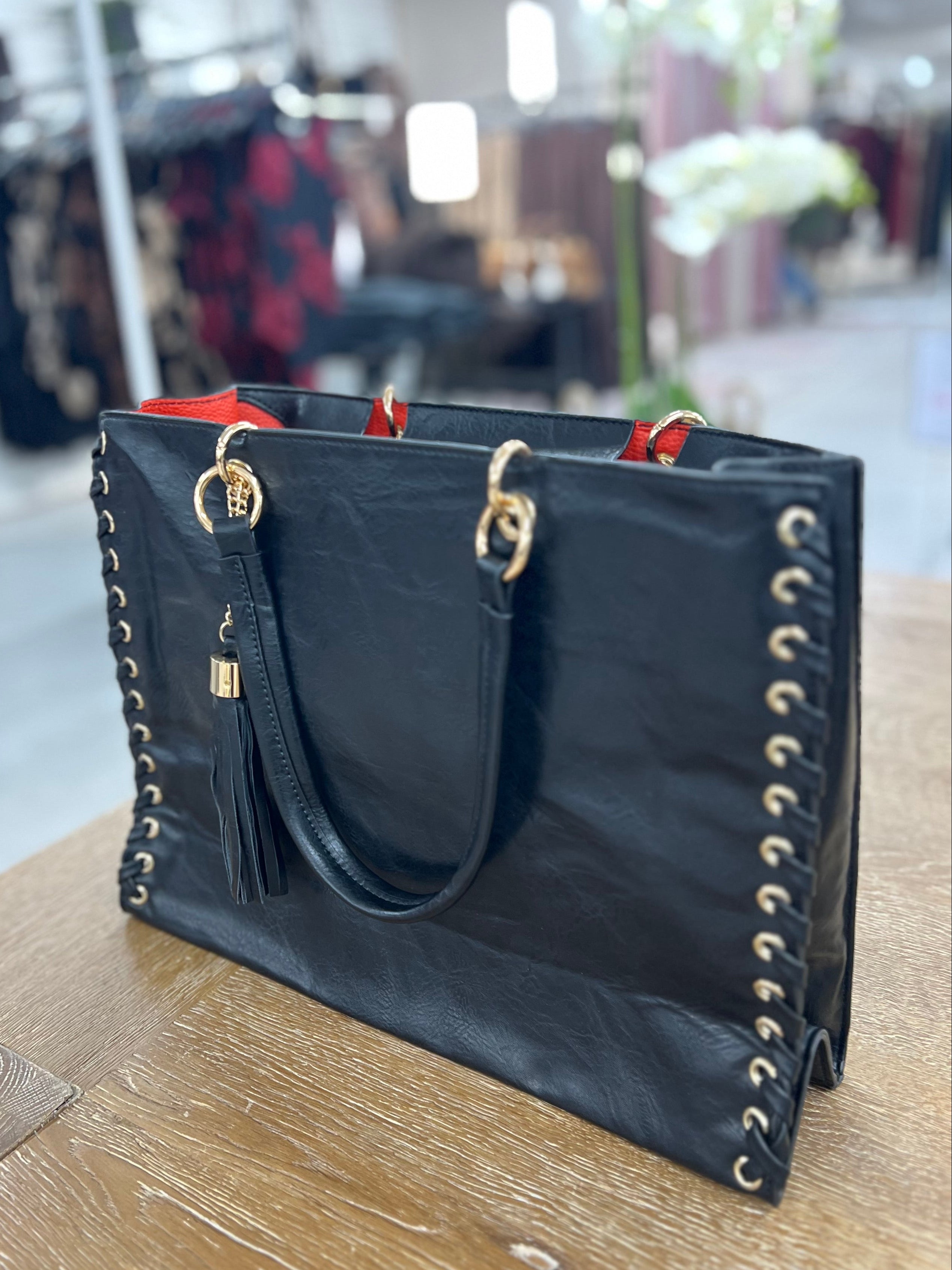 Elegant and timeless handbag in soft, structured black material that suits all occasions. The bag has a decorative braided handle at the front which gives it a unique and modern look. The removable and adjustable shoulder strap means you can easily carry the bag both over the shoulder and crossbody.