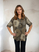 An elegant blouse in 100% viscose with cobbler's collar and round neckline. The buttons go down to the bust and are covered in a glittery, matching fabric – the same fine detail that appears on the breast pocket. This gives the blouse an exclusive and well-made expression. The model is longer in the back than in the front and has sleeves that can be folded down for a longer fit, making it both practical and versatile.