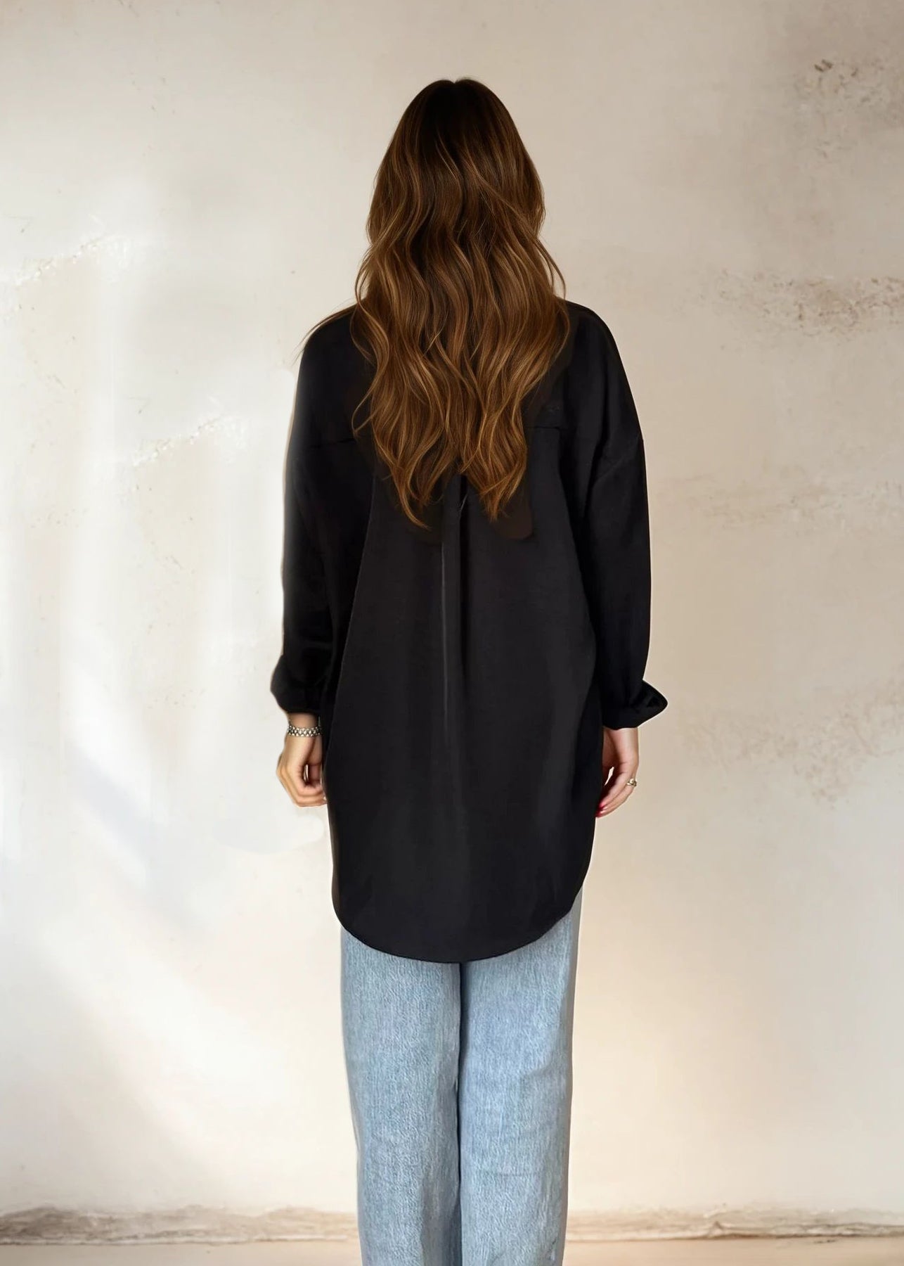 Elegant and timeless oversized shirt in a soft and compliant fabric. With its relaxed fit and extra length of 80 cm, it becomes a versatile garment that works just as well for everyday life as for a more dressed look. Perfect to wear both stuffed in jeans or loose over pants for a modern and chic silhouette.