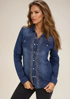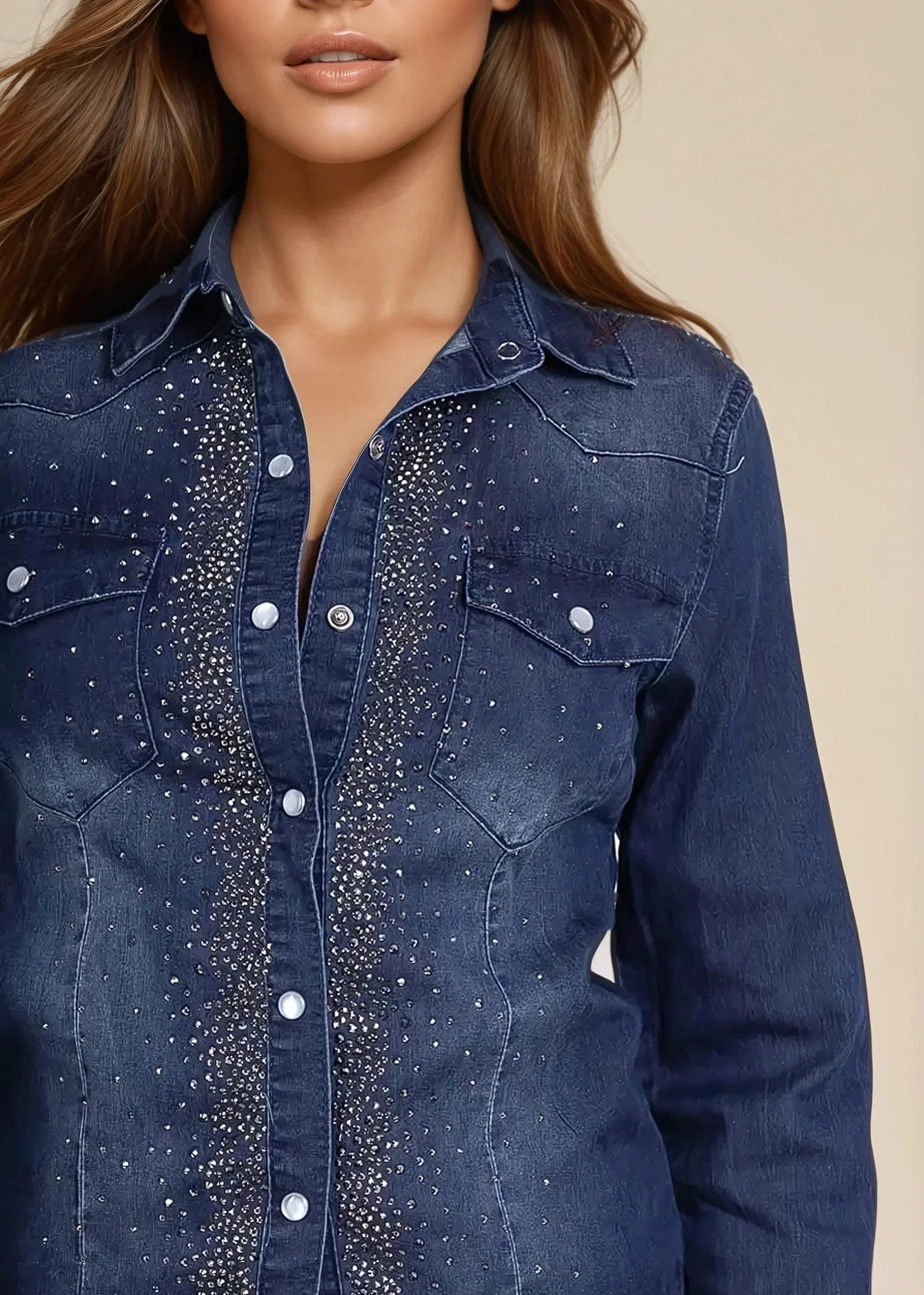 Combine Classic denim with a feminine silhouette in Jeans shirt with pockets. The stretchy and figure -fitting fit gives a flattering look, while The stroke stones on the front Adds an elegant touch. Perfect for both everyday life and more dressed up occasions!
