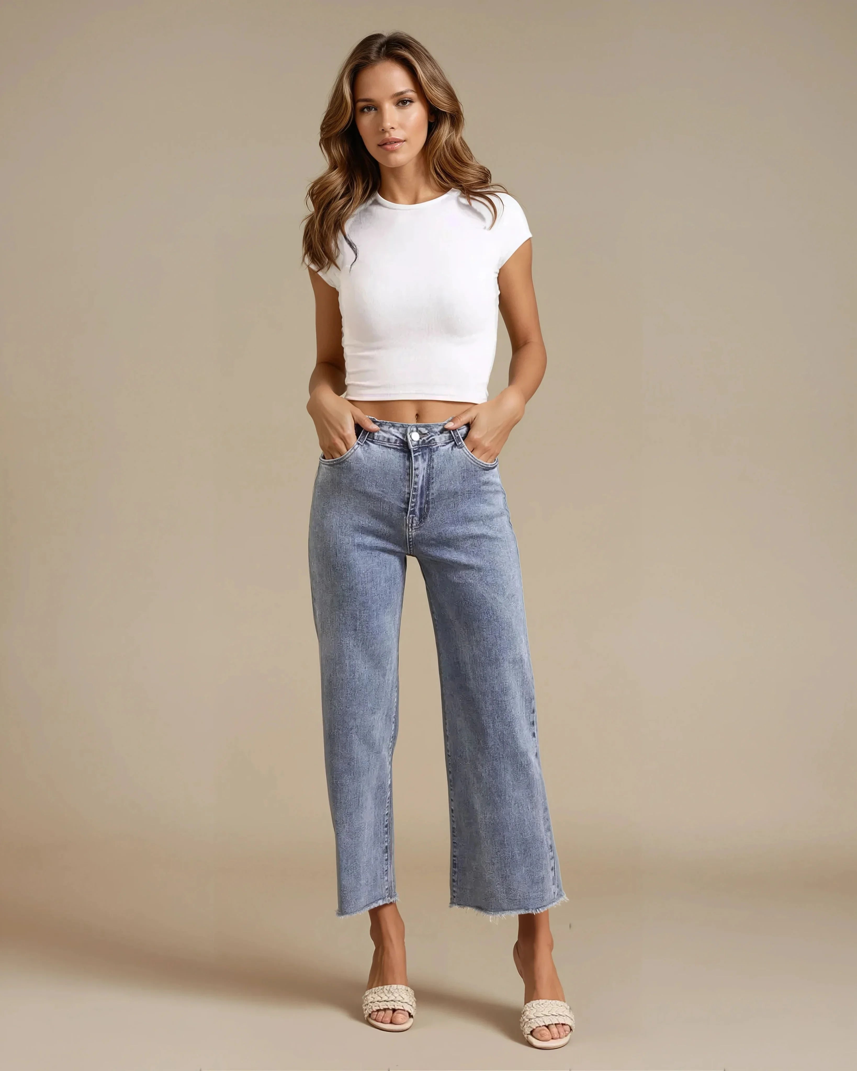 These Wide leg jeans from the French brand G-Smack Combines style and comfort in the best way. Made in one Stretchy denim fabric with one High waist which gives a flattering fit. The Wide legs And they fringed edges at the bottom creates a trendy and relaxed look.