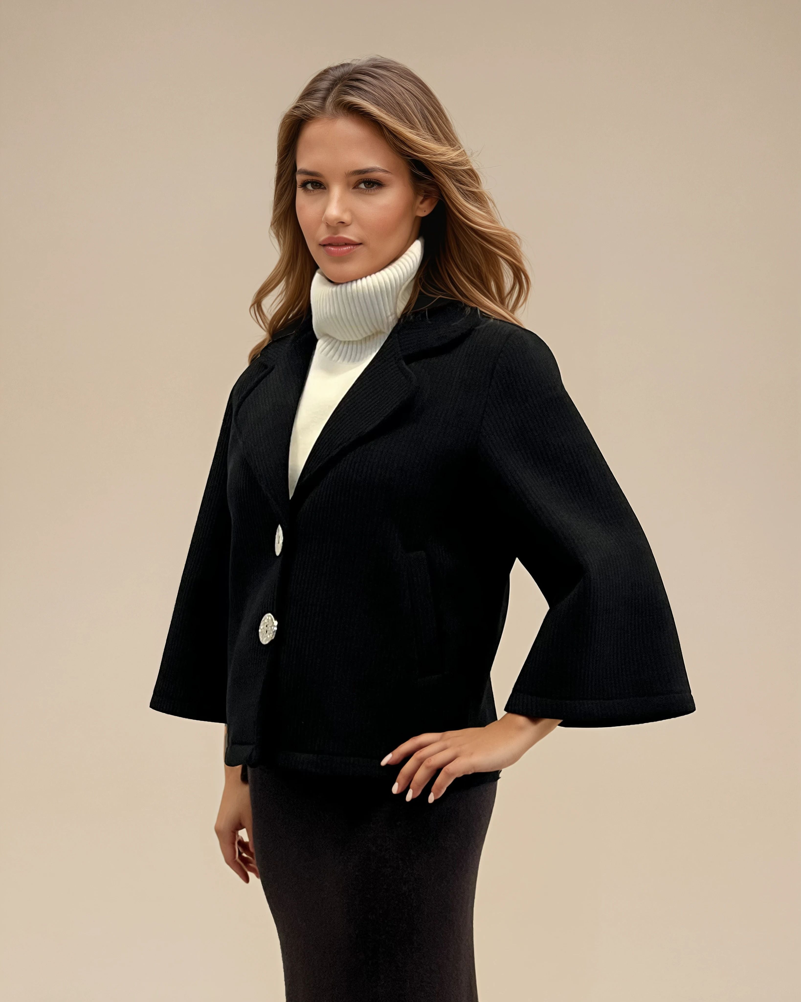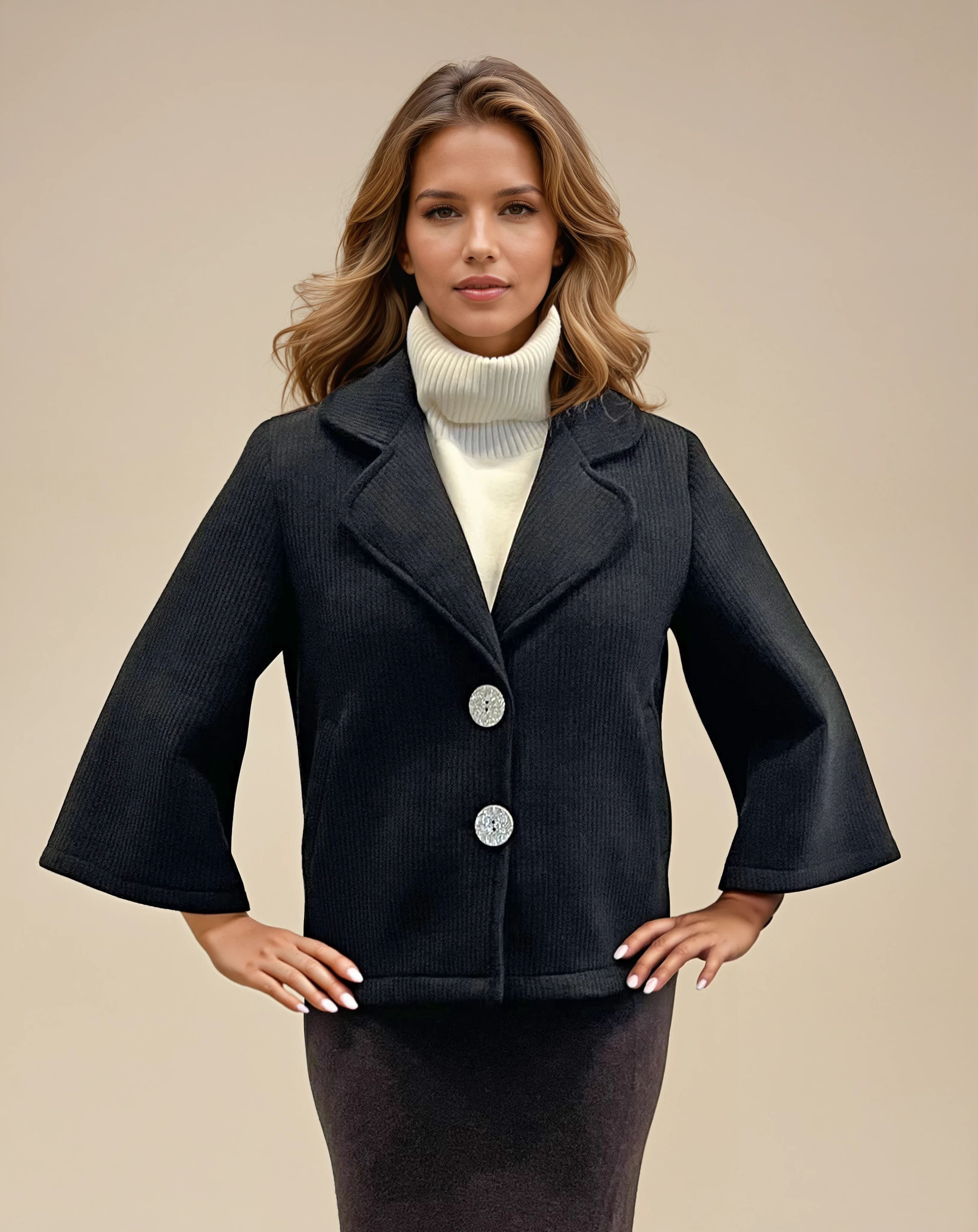 Eva is an elegant and stylish jacket from our own brand Mirelle Design. With its classic collar, marked shoulders and wide three -quarter sleeves, it is both modern and timeless at the same time. The two decorative buttons at the front will be a nice detail that makes the jacket unique and sophisticated.