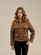 Jacket Sandra is an elegant and trendy jacket that combines soft teddy fabric with modern design. The fluffy bouclé structure gives a warm and luxurious feel, while the decorative gold buttons at the front and on the pockets create a sophisticated finish. The model is shorter for a stylish silhouette and fits as well as light jacket as a stylish overshirt during cooler days.