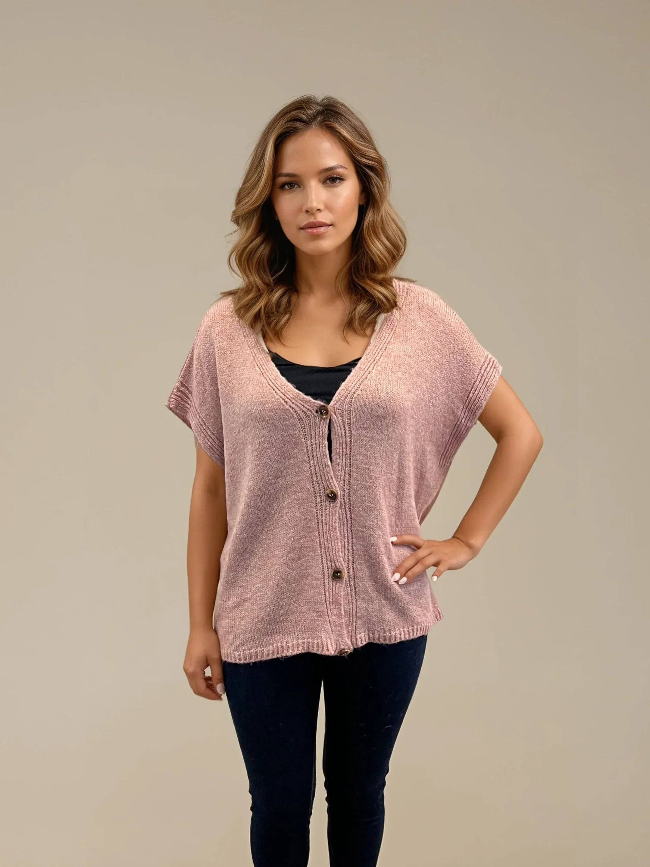Låt dig svepas in i komfort och stil med vår ärmlösa kofta Fanny. Den här stickade favoritkoftan är perfekt för lager-på-lager och funkar lika bra hemma som på jobbet eller till vardagslooken. Den har en avslappnad passform med v-ringning, knäppning framtill och ett mjukt fall som ger en smickrande silhuett.