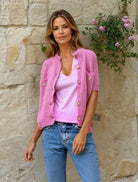 The perfect combination of comfort and elegance! Our knitted short -sleeved cardigan is a versatile garment that is just as good to wear for yourself as styleing layers in layers. With two decorative front pockets adorned with buttons, it gives a sophisticated but relaxed look.