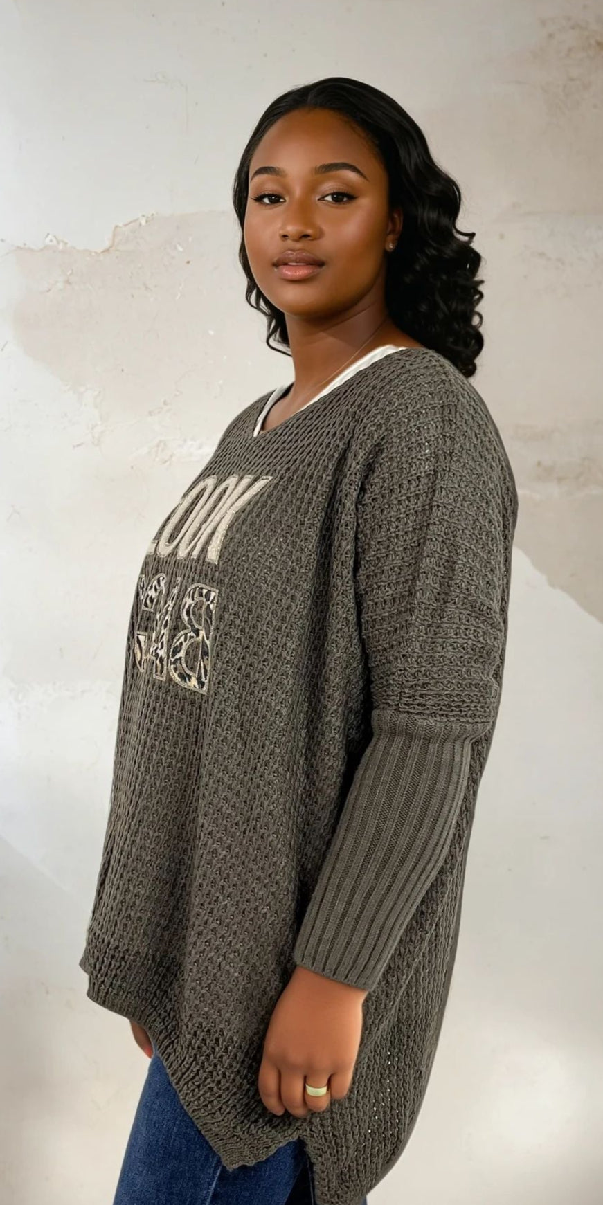 A soft and trendy knitted sweater with attitude! The Lookback shirt in rough-knit quality has a relaxed oversize cut with V-ring and a marked message in the shimmering letters with animal patterned detail.