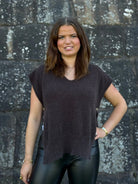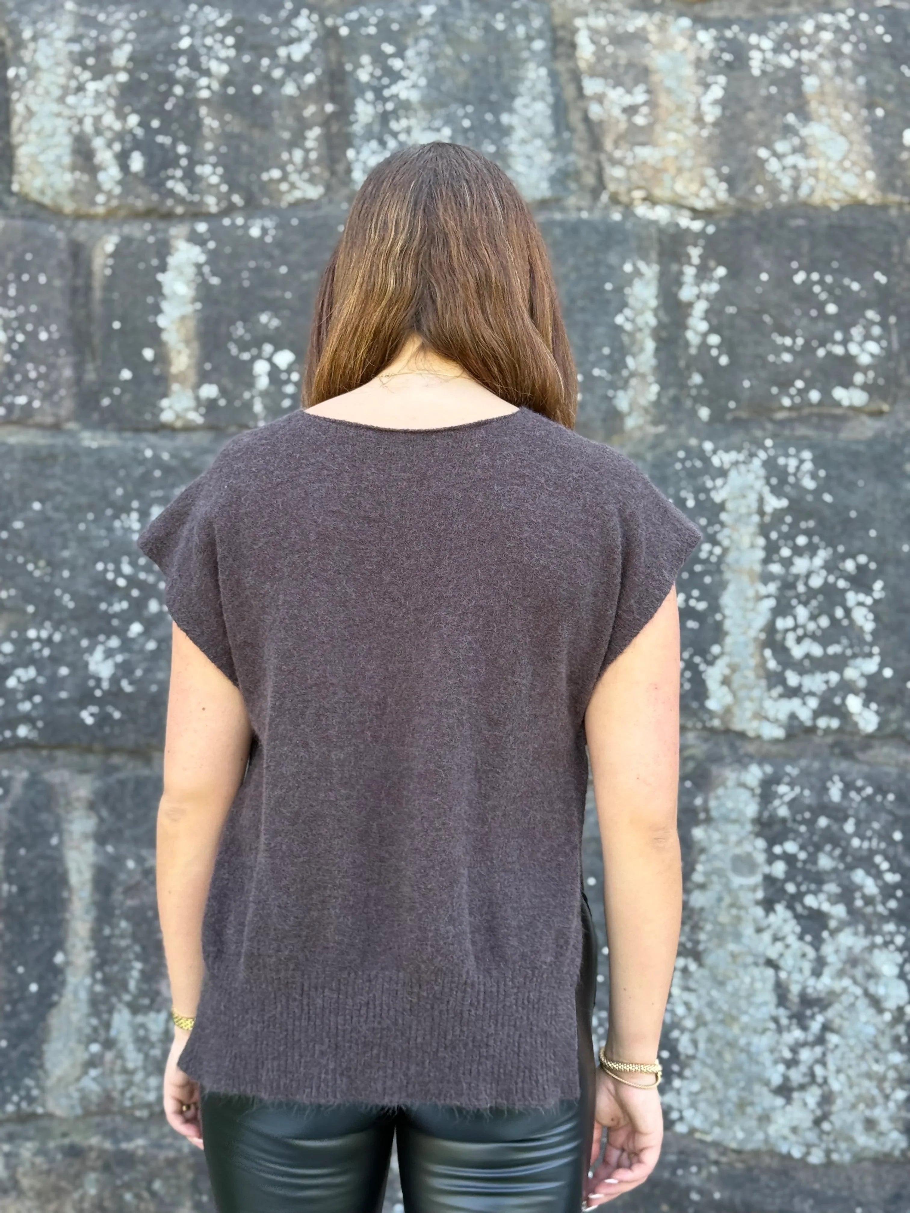 En unik detalj är den öppna sidan med en diskret knapp under armhålan, som både är dekorativ och gör plagget extra bekvämt att bära över skjortor, blusar eller klänningar.