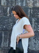 En unik detalj är den öppna sidan med en diskret knapp under armhålan, som både är dekorativ och gör plagget extra bekvämt att bära över skjortor, blusar eller klänningar.