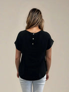 Decorated with exclusive gold prints of flowers, text and butterflies 🦋 as well as three stylish buttons in the neck. The rounded neckline and the hollow sleeve create a soft, elegant silhouette.