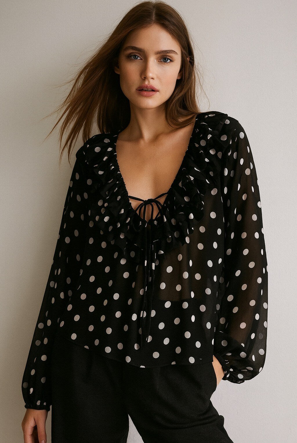 Blus Prickig is the perfect mix of romantic and trendy - with a light, airy fit and a polka dot pattern that never goes out of style. It has a feminine V-neckline, decorative frill details and a tie at the front that gives a soft and elegant silhouette. The sleeves are long-sleeved with light volume, which makes the blouse feel both chic and comfortable.