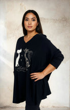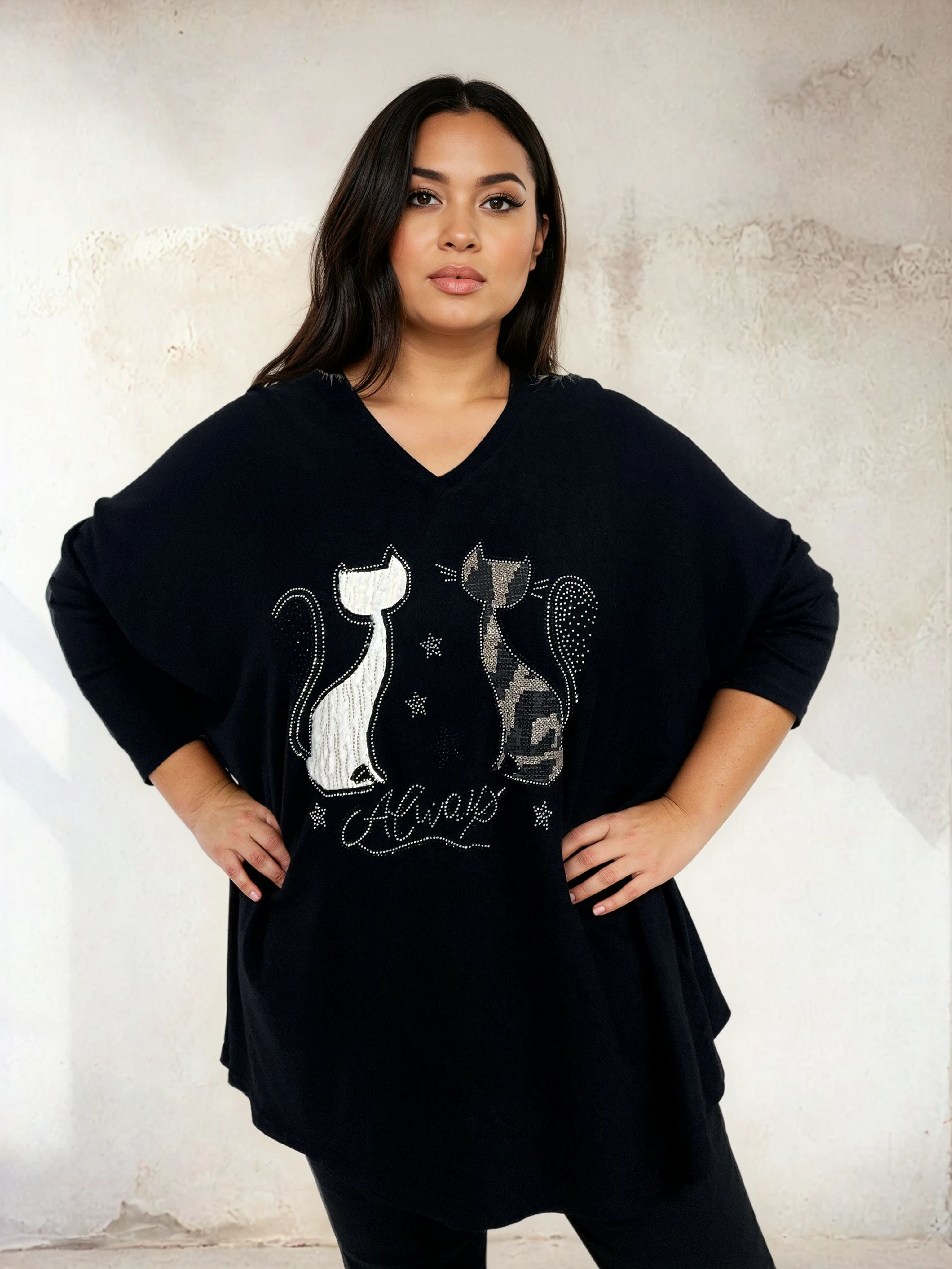 At the front, the sweater is adorned with a charming cat motif with sparkling rhinestones and embroidered details that provide a personal and creative touch.