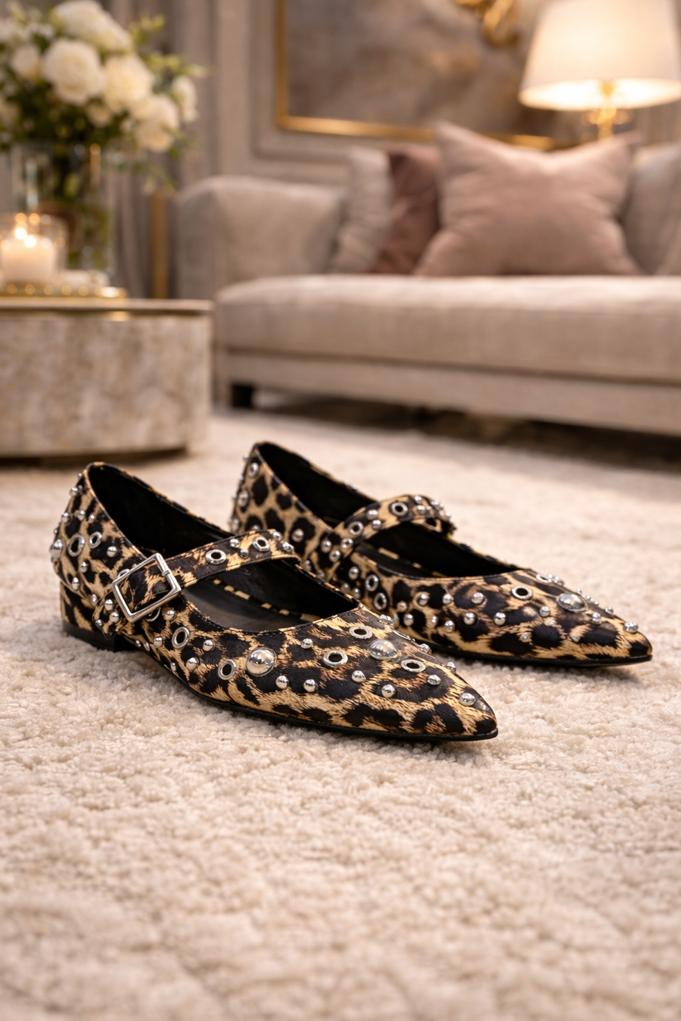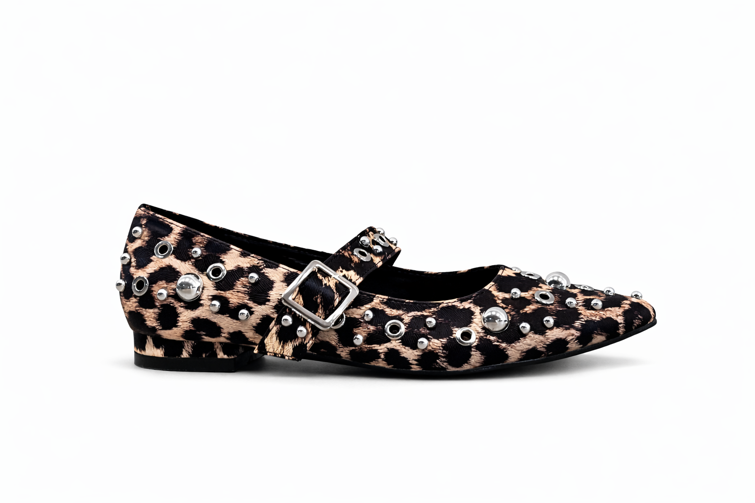 Add a trendy and confident touch to your outfit with these pointy ballerinas in leopard print. The classic Mary Jane model gets an edgy lift with decorative silver studs and metal rings that create a sassy but elegant look. The leopard-patterned material gives the shoe a fashion-forward feel, while the pointed toe contributes to a feminine and stylish silhouette.