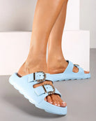 Comfortable, cool and Incredibly easy -Our French flip-flops in synthetic material are a must in each wardrobe. With chunky buckles pimped with pearl details and a soft footbed are the ones made for you to slip around like a queen, whether you are on your way to the beach or just to the refrigerator.