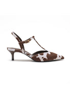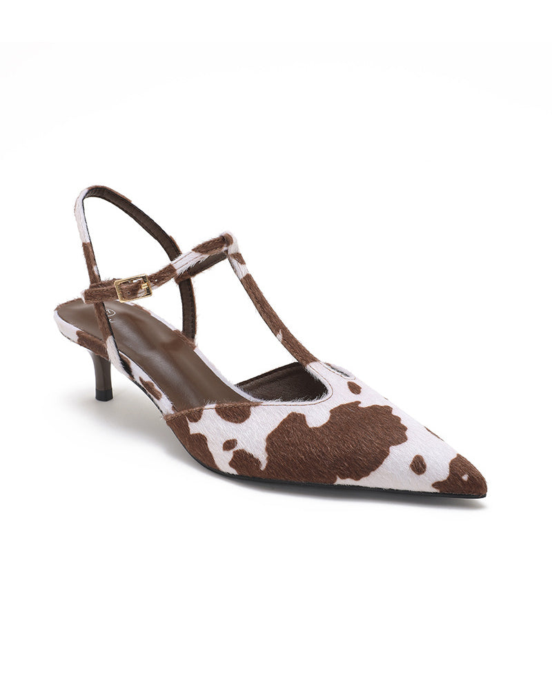 Details: Pointed toe, t-strap with buckle, narrow heel