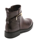 Klassiset ja tyylikkäät nilkkasaappaat ruskeassa varjossa, joka on suunniteltu helposti sovittamaan sekä päivittäisiin että työasuihin. Kengillä on tyylikäs jännitys yksityiskohta kullassa, joka antaa sivulle hienostuneen tunnelman ja käytännöllisen vetoketjun helpon tiivistymisen ja poistamisen vuoksi.