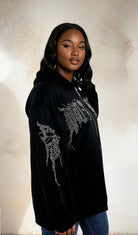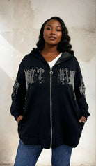 En mjuk och bekväm huvtröja med dragkedja och huva – men med en twist! Framsidan och ärmarna är dekorerade med gnistrande strassmotiv som skapar ett glamoröst uttryck i kontrast till den sportiga modellen.