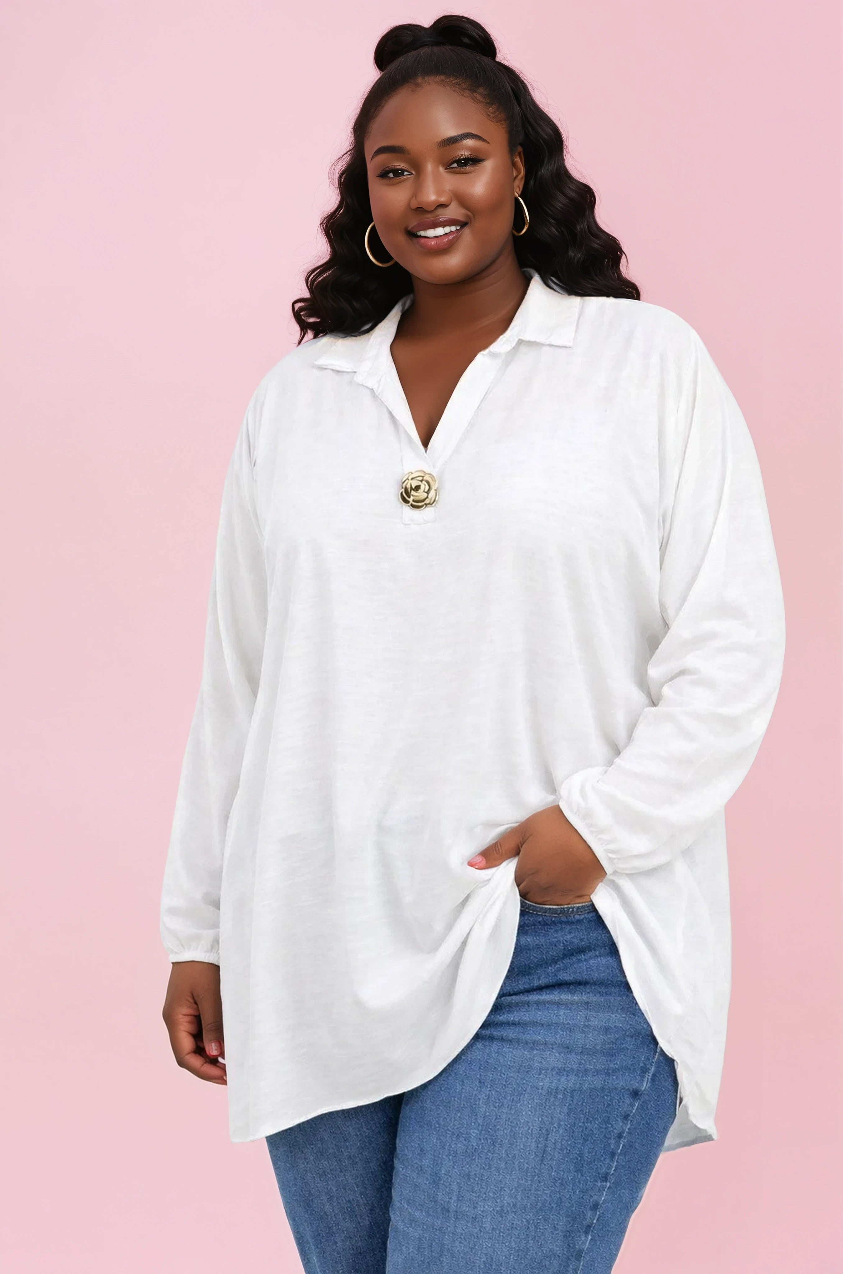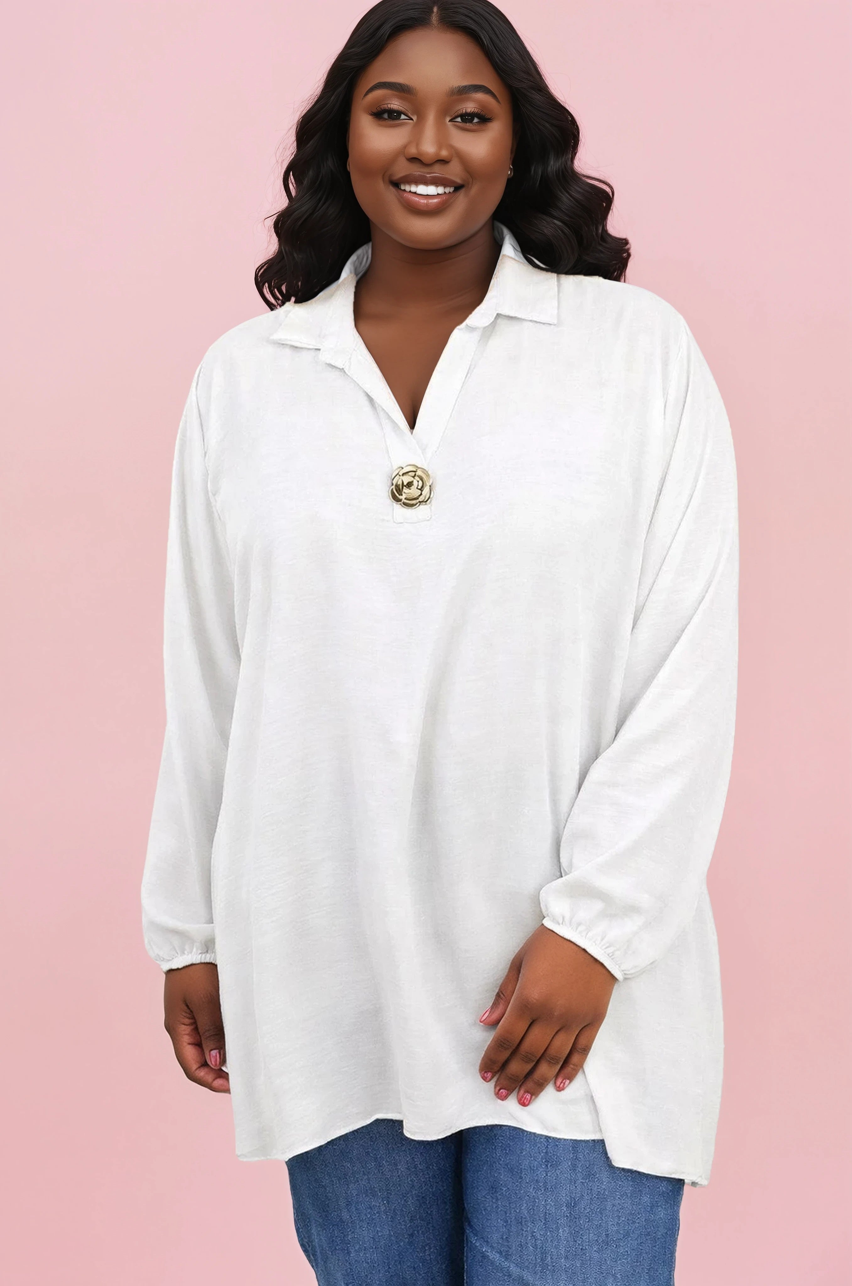 Tunikan etuosassa on klassinen V-pääntie ja koristeellinen kullanvärinen ruusu, joka luo eksklusiivisen ja naisellisen ilmeen. Selkä on kauniisti laskostettu, mikä luo lisäliikettä ja mukavaa pudotusta. Pitkät hihat on viimeistelty pehmeällä kuminauhalla mukavan istuvuuden takaamiseksi.