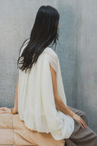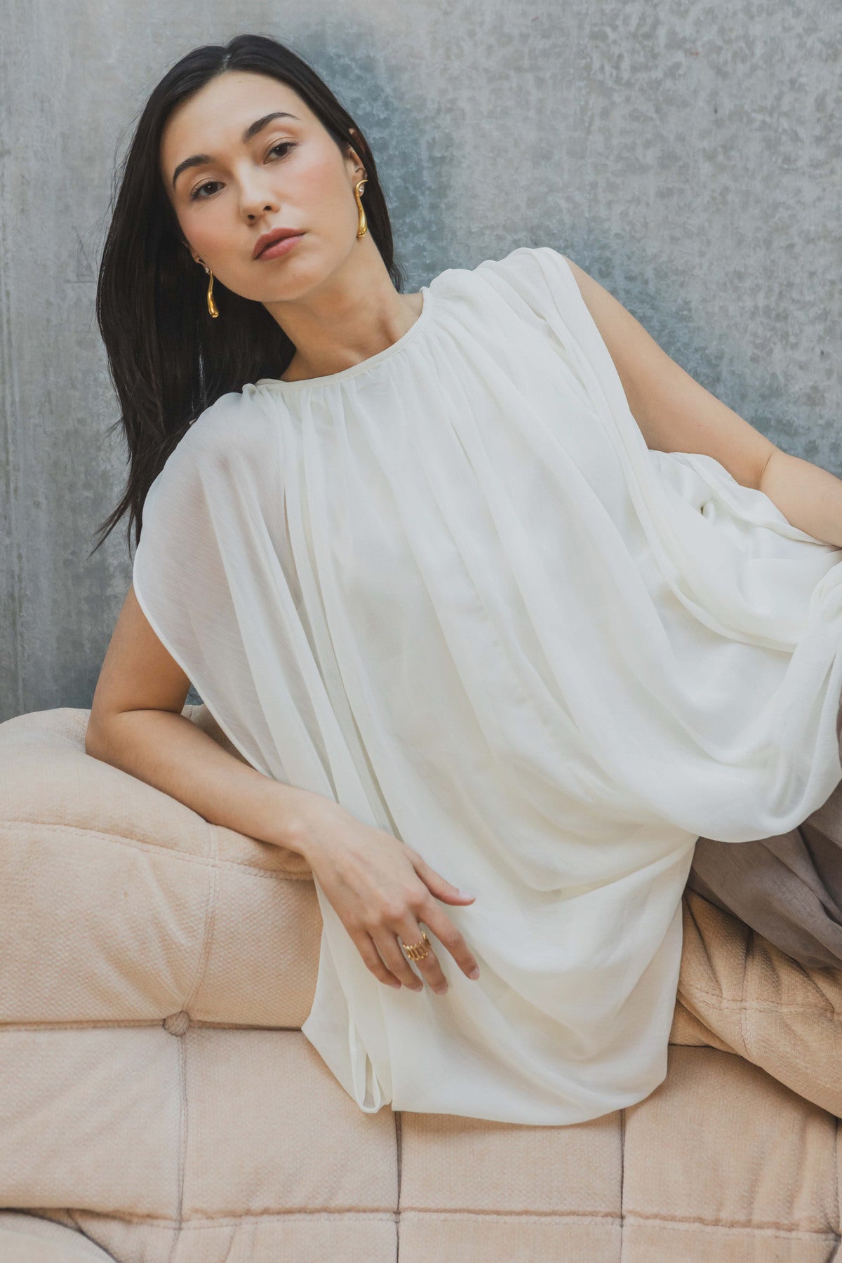 Tämä pusero on tyylikäs ja ilmava vaate, joka antaa naisellisen ja hienostuneen siluetin. Laskeva muotoilu pyöreällä pääntiellä ja kauniisti rypytetty kaulus luo pehmeän pudotuksen, kun taas viitan hihat antavat eksklusiivisen ja modernin ilmeen. Hieman levenevä alareuna antaa mukavan puseron vaikutelman, joka istuu imartelevasti vartalolle.