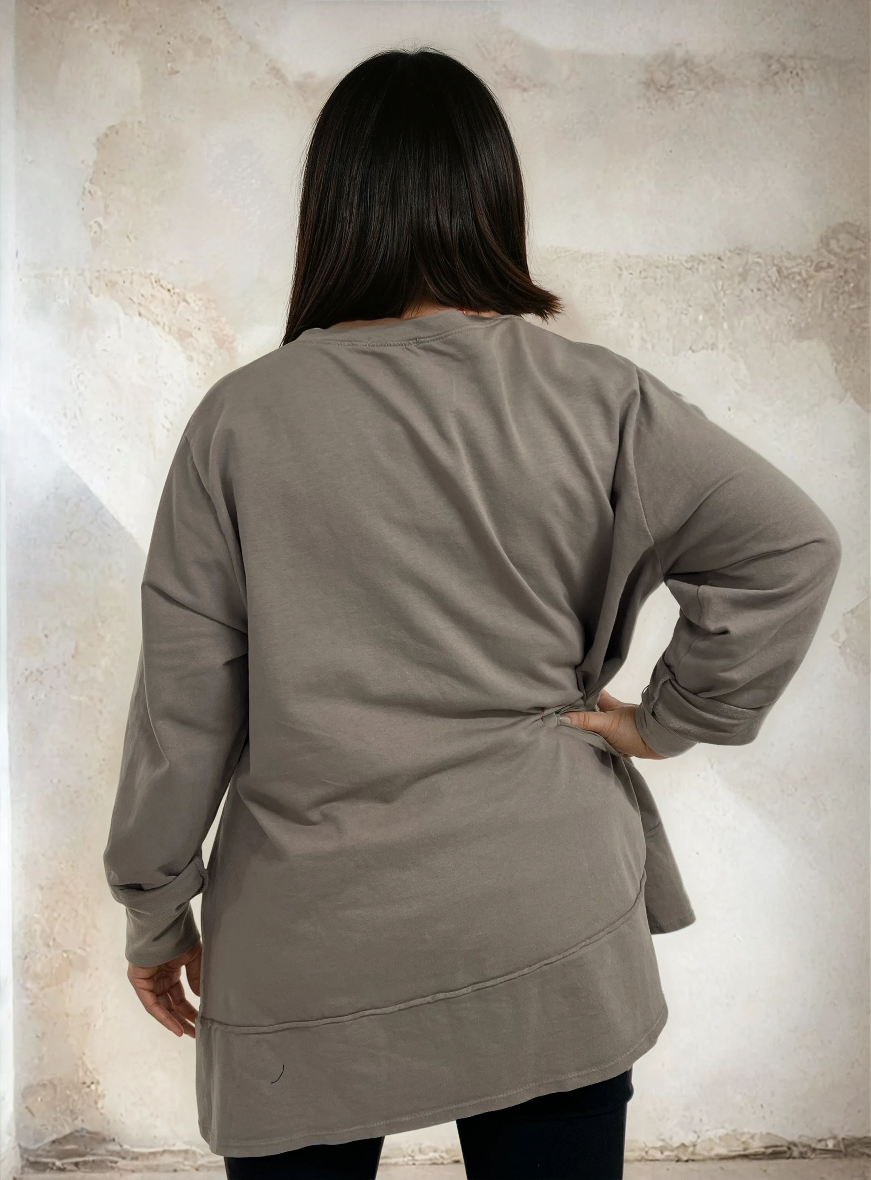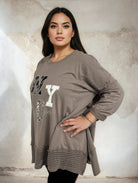 Pusero Julia on trendikäs ja mukava päivittäinen paita, jossa on tyylikkäitä yksityiskohtia, jotka nostavat asusi. Siinä on rento istuvuus pyöreällä pääntie ja taitettava hiha. Edessä pusero on koristeltu suurella NYC -tulostuksella erilaisissa kuvioissa, joissa on kimaltelevia kiviä, jotka antavat modernin ja kaupunkien tunteen. Pohjäreunassa on koristeellinen virkattu reuna, joka luo ainutlaatuisen ja naisellinen kosketuksen.