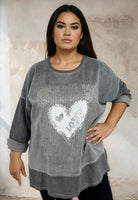 Edessä villapaita on koristeltu sydämen aiheella ja tekstirakkaus metallisella painatuksella, joka antaa modernin ja leikkisän kosketuksen.