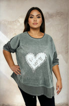 Edessä villapaita on koristeltu sydämen aiheella ja tekstirakkaus metallisella painatuksella, joka antaa modernin ja leikkisän kosketuksen.