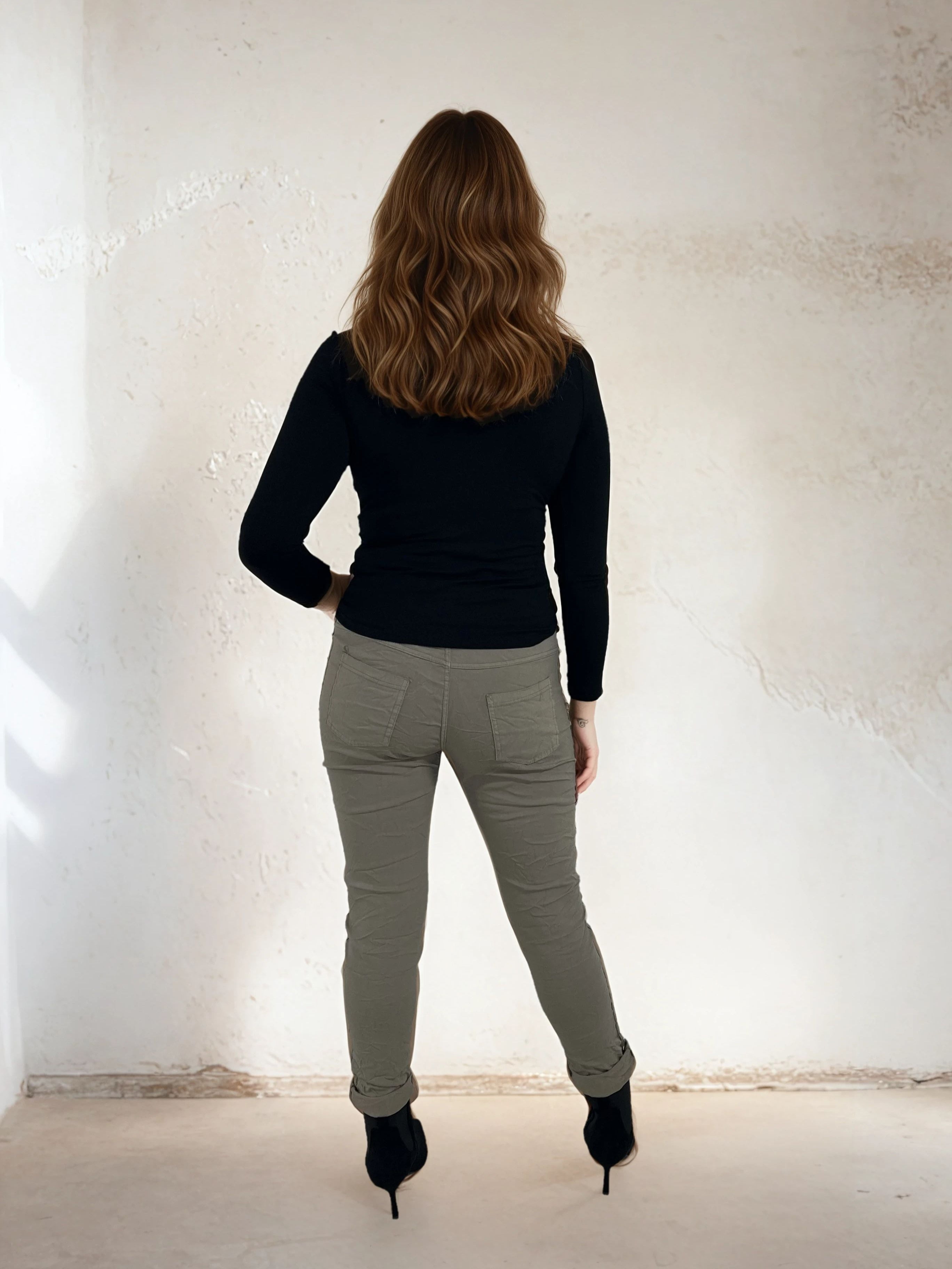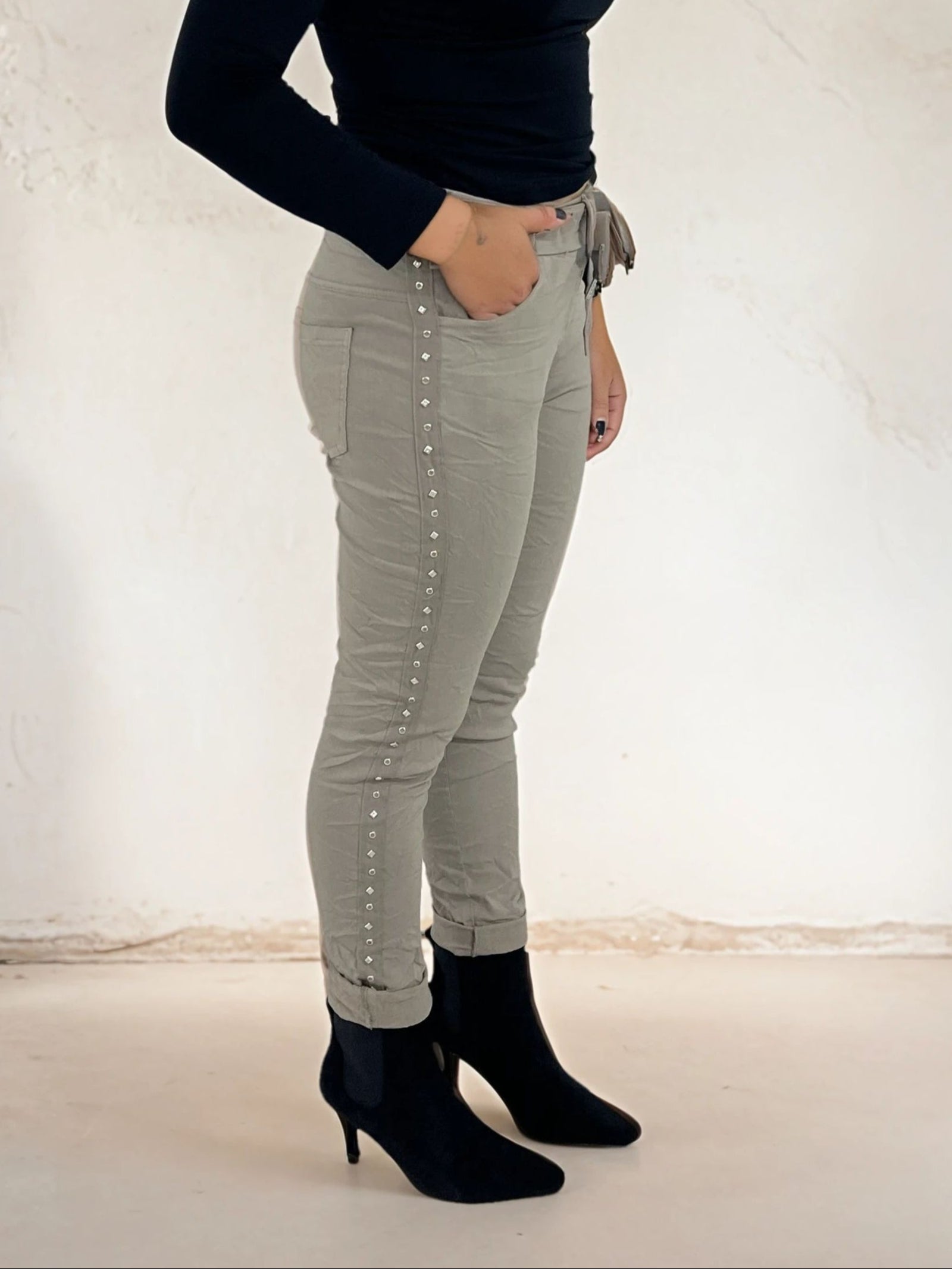 Nämä housut yhdistävät klassisen lenkkeilymallin modernilla kierroksella. Koristeellisilla niiteillä sivuilla, ne saavat ainutlaatuisen ilmeen, joka voidaan helposti muotoilla sekä päivittäisiin että juhlallisempiin tilaisuuksiin. Pehmeä ja joustava viskoosiseos tekee niistä mukavia koko päivän, samalla kun muotoilee itsensä hienosti vartalon jälkeen.