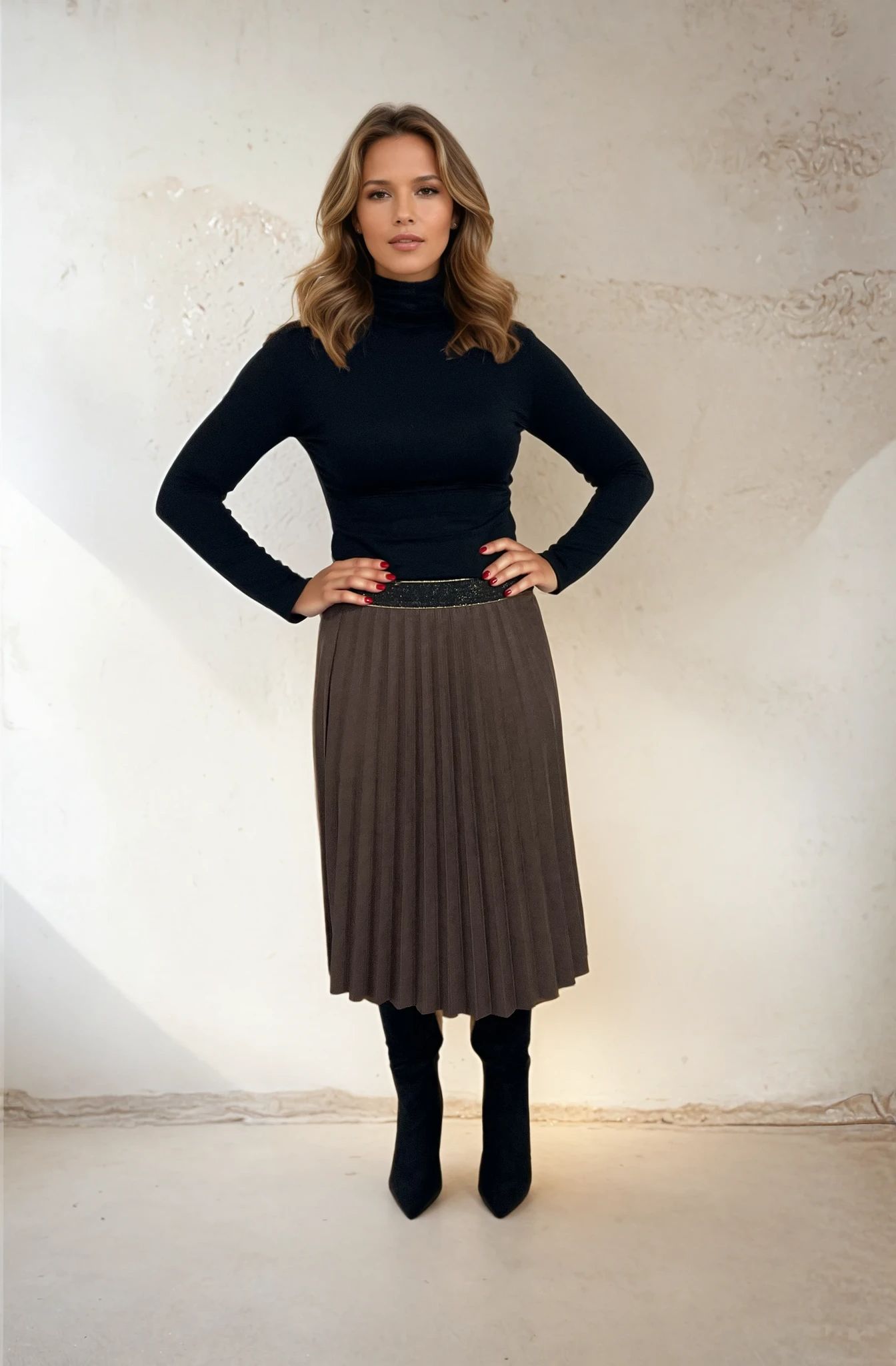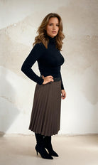 Tyylikäs ja ajaton laskostettu hame pehmeässä ja yhteensopivassa kankaassa. Klassinen muotoilu pleikureilla antaa kauniin siluetin ja tekee hameen helpon muotoilemaan sekä joka päivä että pukeutuneempia tilaisuuksia. Vyötärö on joustava koriste -joustava, joka antaa mukavan istuvuuden ja mukavan yksityiskohdan.