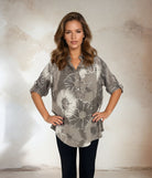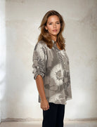 Tyylikäs pusero 100 % viskoosia suutarin kaulus ja pyöreä pääntie. Napit menevät rintaan asti ja ne on peitetty kimaltelevalla, yhteensopivalla kankaalla – sama hieno yksityiskohta kuin rintataskussa. Tämä antaa puserolle ainutlaatuisen ja hyvin tehdyn ilmeen. Malli on takaa pidempi kuin edestä ja siinä on hihat, jotka voidaan taittaa alas pidempään istuvuutta varten, mikä tekee siitä sekä käytännöllisen että monipuolisen.